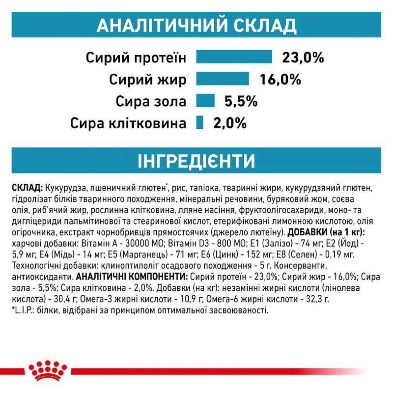 Корм рекомендується використовувати при виявленні перших ознак проблем з шкірним покривом, оскільки чиста і здорова шкіра виконує, в першу чергу, захисну функцію організму. Ця дієта створена у вигляді сухого, повнораціонного корми і рекомендована для дорослих собак. Корм має унікальну, ретельно збалансовану рецептуру, доповнену мікроелементами і вітамінами, всі поживні компоненти корму відмінно засвоюються організмом собаки і забезпечують його зарядом бадьорості і енергії.