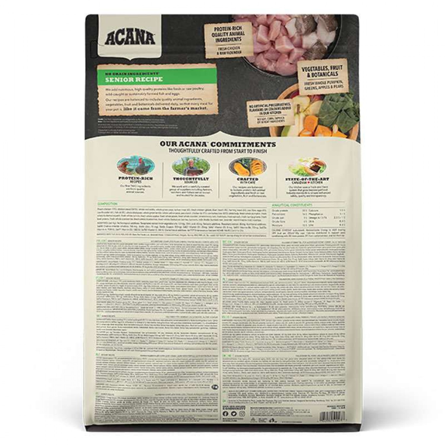Коли це стосується корму ACANA, кожен інгредієнт має значення. Саме тому, рецептура Senior Recipe створюється з турботою щоб забезпечувати здоров’я старіючих собак. Рецептура АКАНА Сеньйор Ресіпе на 65% переповнена якісними м’ясними інгредієнтами, такими як м’ясо канадських курчат та сирої камбали та на 35% збалансована фруктами, овочами та травами.