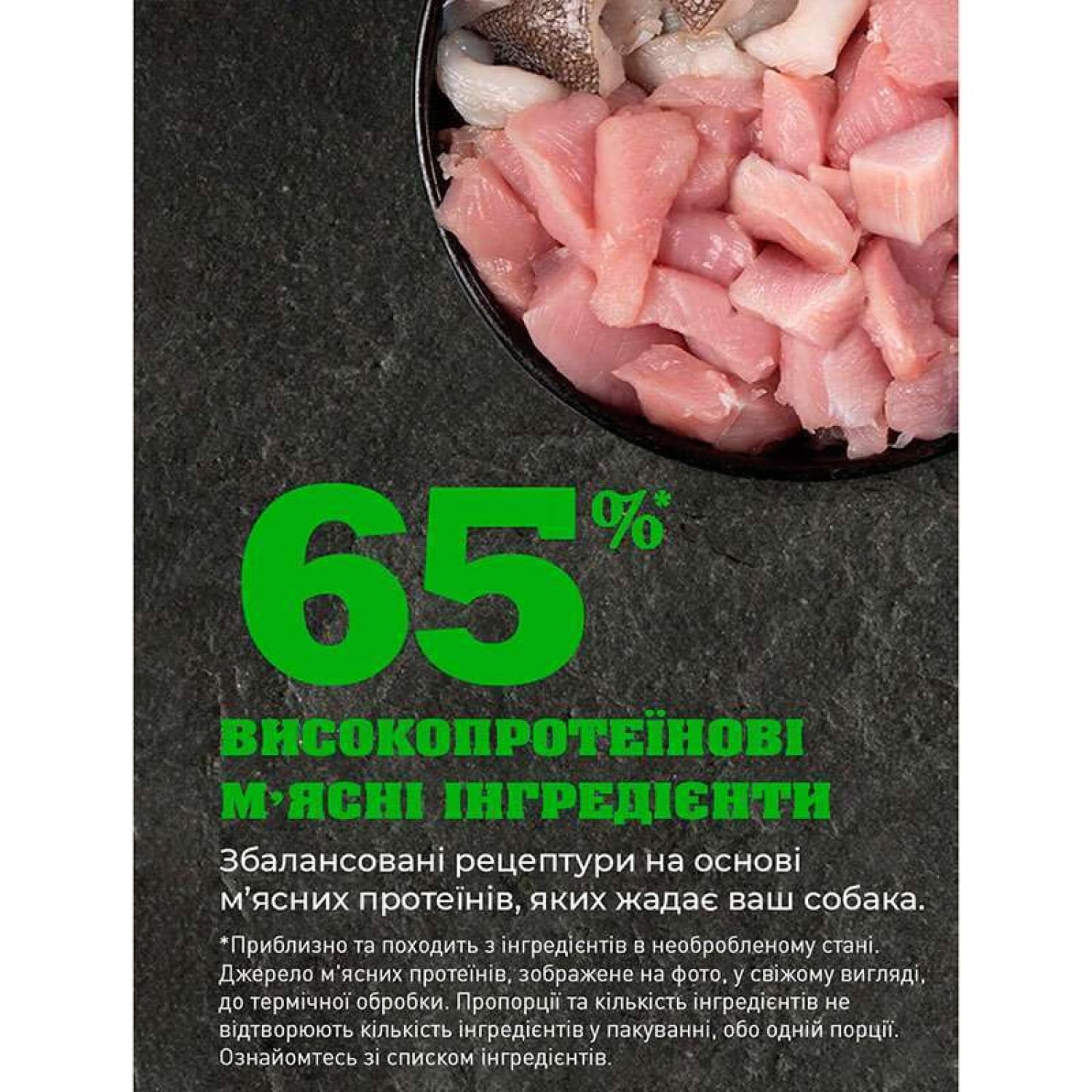 - Містить м'ясо птиці, органи та хрящі - забезпечують надходження нутрієнтів у найбільш натуральній та поживній формі. М'язові тканини забезпечують тварину білками і жирами, печінка, нирки і шлунок - вітамінами і мінералами, кістки і хрящі - кальцієм і фосфором.