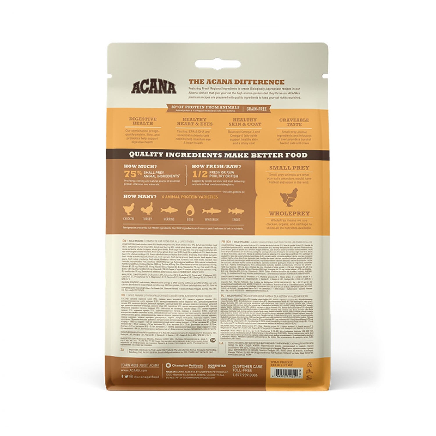 Котам необхідні раціони з багатим вмістом м'ясних протеїнів. Надихаючись нашими великими преріями і кришталевими озерами, рецептура ACANA Wild Prairie переповнена м'ясними інгредієнтами високої якості: м'ясом курчат і індички, вирощених на вільному вигулі, гніздовими яйцями і прісноводною рибою, виловленою в дикій природі.