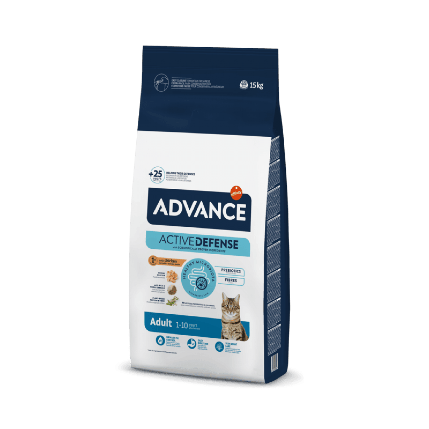 Формула Active Defense у кормах ADVANCE - це науково розроблена система підтримки природного імунітету кота. Завдяки поєднанню пробіотиків, пребіотиків, натуральної клітковини та імуноглобулінів, вона сприяє здоровому травленню, покращує баланс кишкової мікрофлори та підсилює захисні функції організму. Це допомагає вашому улюбленцю краще засвоювати поживні речовини та протистояти зовнішнім чинникам, забезпечуючи йому активне і здорове життя щодня.