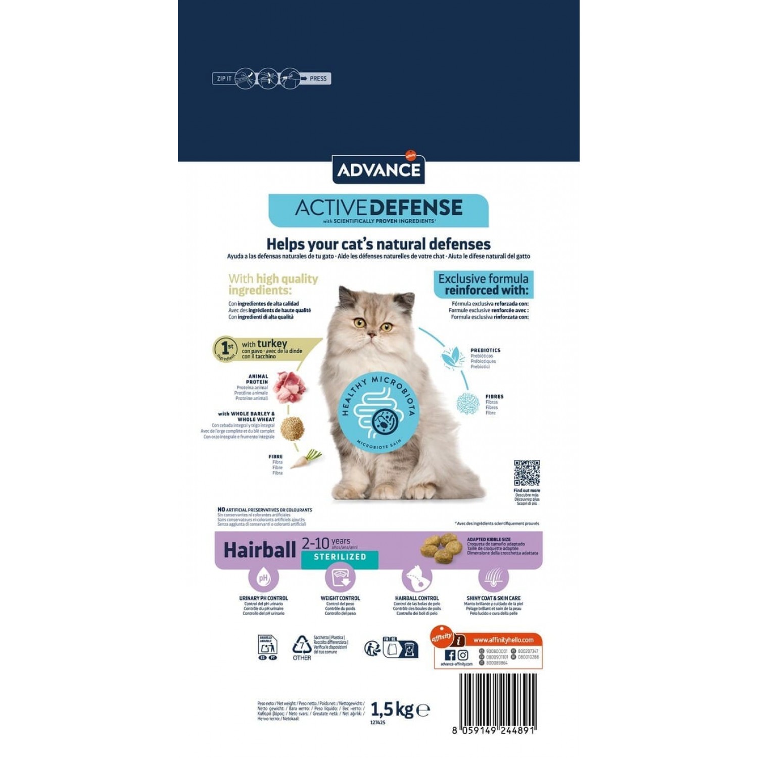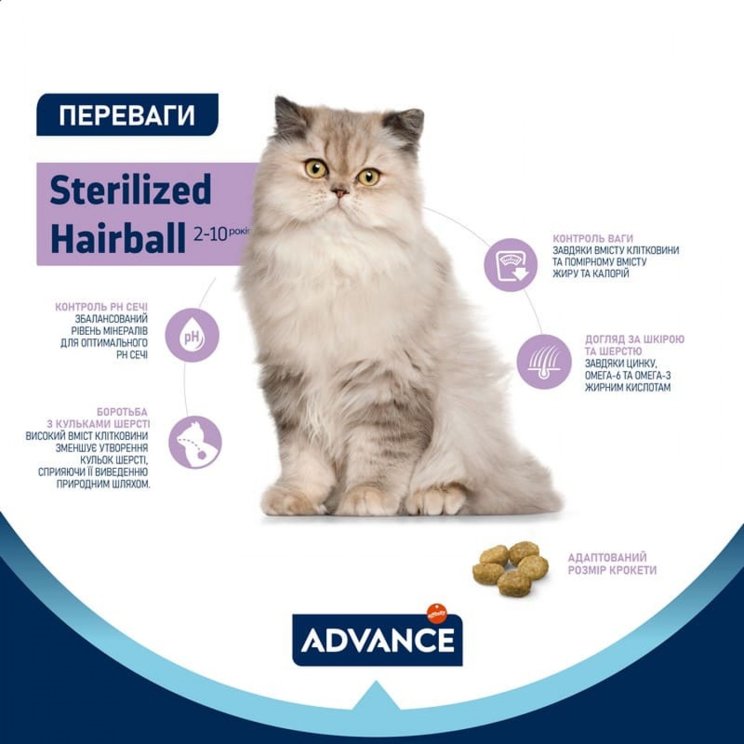 Advance Cat Sterilized Hairball - спеціалізований корм, створений для дорослих стерилізованих котів, які стикаються з труднощами виведення шерсті з організму. Його унікальна формула сприяє природному очищенню травної системи від шерстяних грудок, забезпечуючи комфорт і здоров’я вашого улюбленця. Окрім ефективної боротьби з проблемою ковтання шерсті, корм піклується про загальний стан здоров’я кота. Він підтримує збалансований раціон, що допомагає зберігати оптимальну вагу після стерилізації, зміцнює імунітет та сприяє здоровому обміну речовин. Завдяки цьому ваш кіт відчуває себе активним і комфортним, а шерстяні грудки більше не викликають дискомфорту.