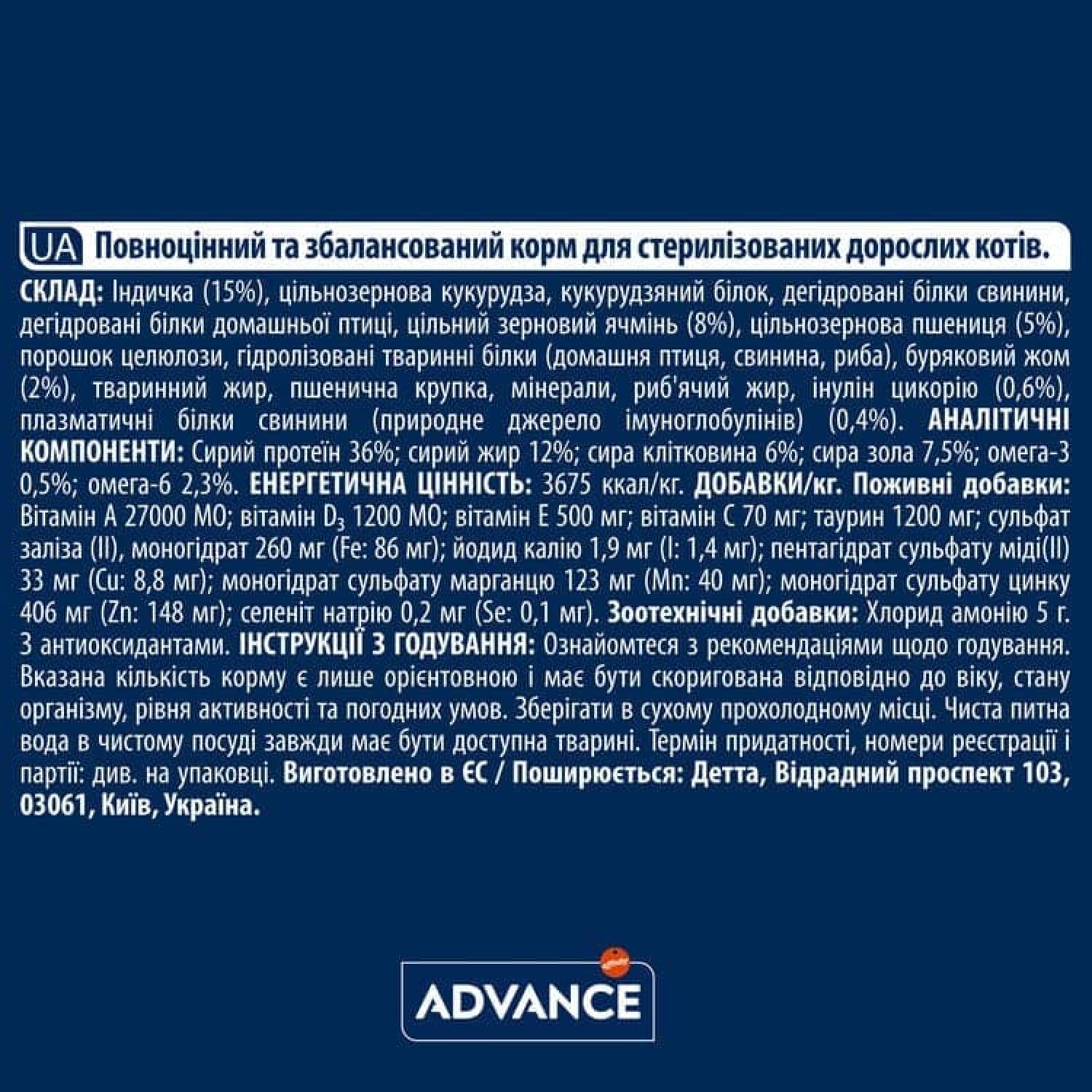 Гарантований аналіз: сирий протеїн - 36%, сирий жир - 12%, сира клітковина - 6%, сира зола - 7,5%, омега-3 - 0,5%, омега-6 - 2,3%.