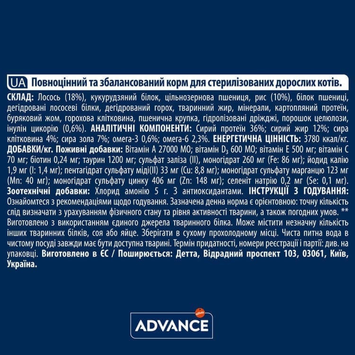 Advance Cat Sterilized Salmon Sensitive сухий корм для стерилізованих котів з чутливим травленням з лососем.
