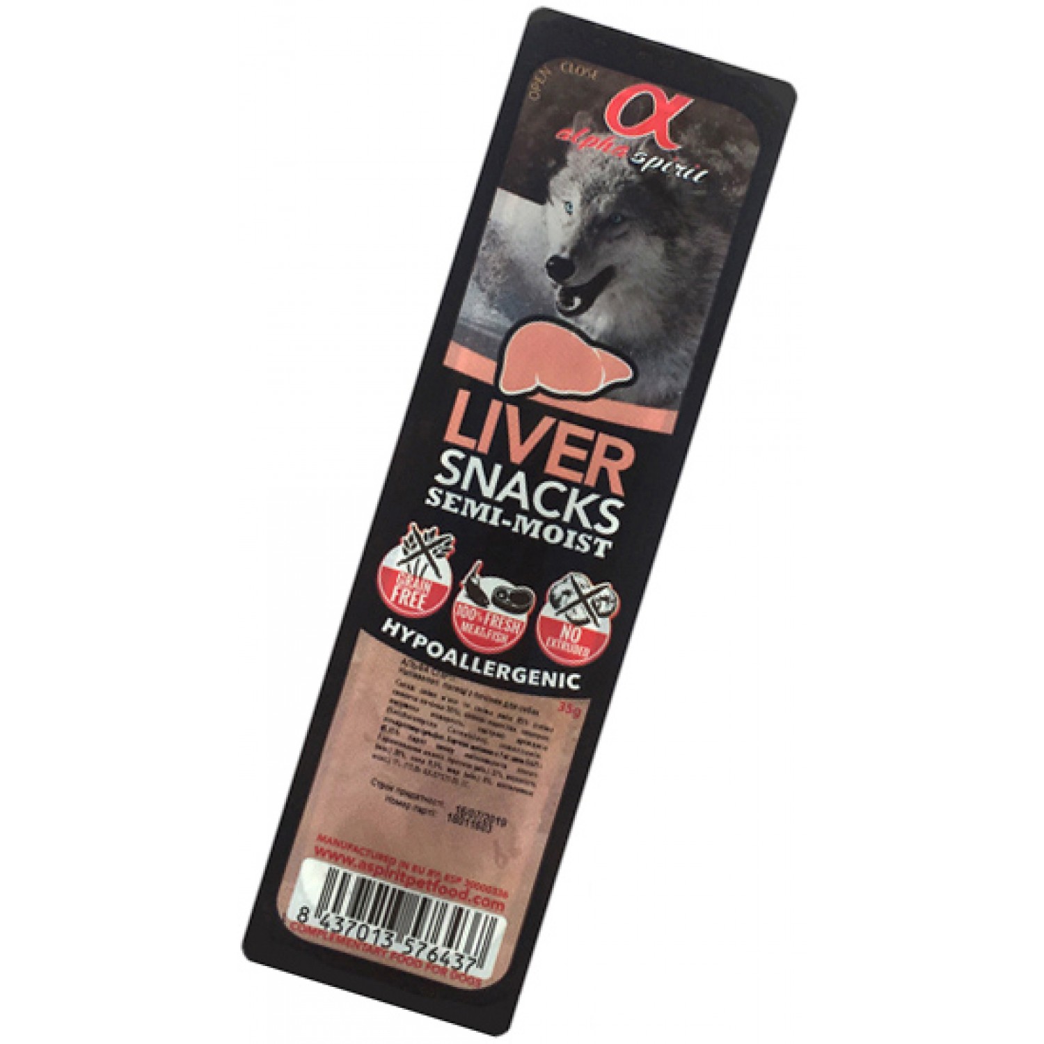 Alpha Spirit Snacks - гіпоалергенні беззернові напіввологі ласощі для собак у вигляді жувальних кубиків. Ласощі Alpha Spirit виготовлено виключно зі свіжого м'яса та риби. Для приготування 1 кг напіввологих ласощів Alpha Spirit Liver використано 1,68 кг свіжого м'яса та 0,42 кг свіжої риби. Свіжі інгредієнти готуються при низькій температурі, зберігаючи поживні речовини, вітаміни та мінерали. Продукція виготовляється без додавання м'ясного борошна чи жирів, а також не містить зерна та глютену.