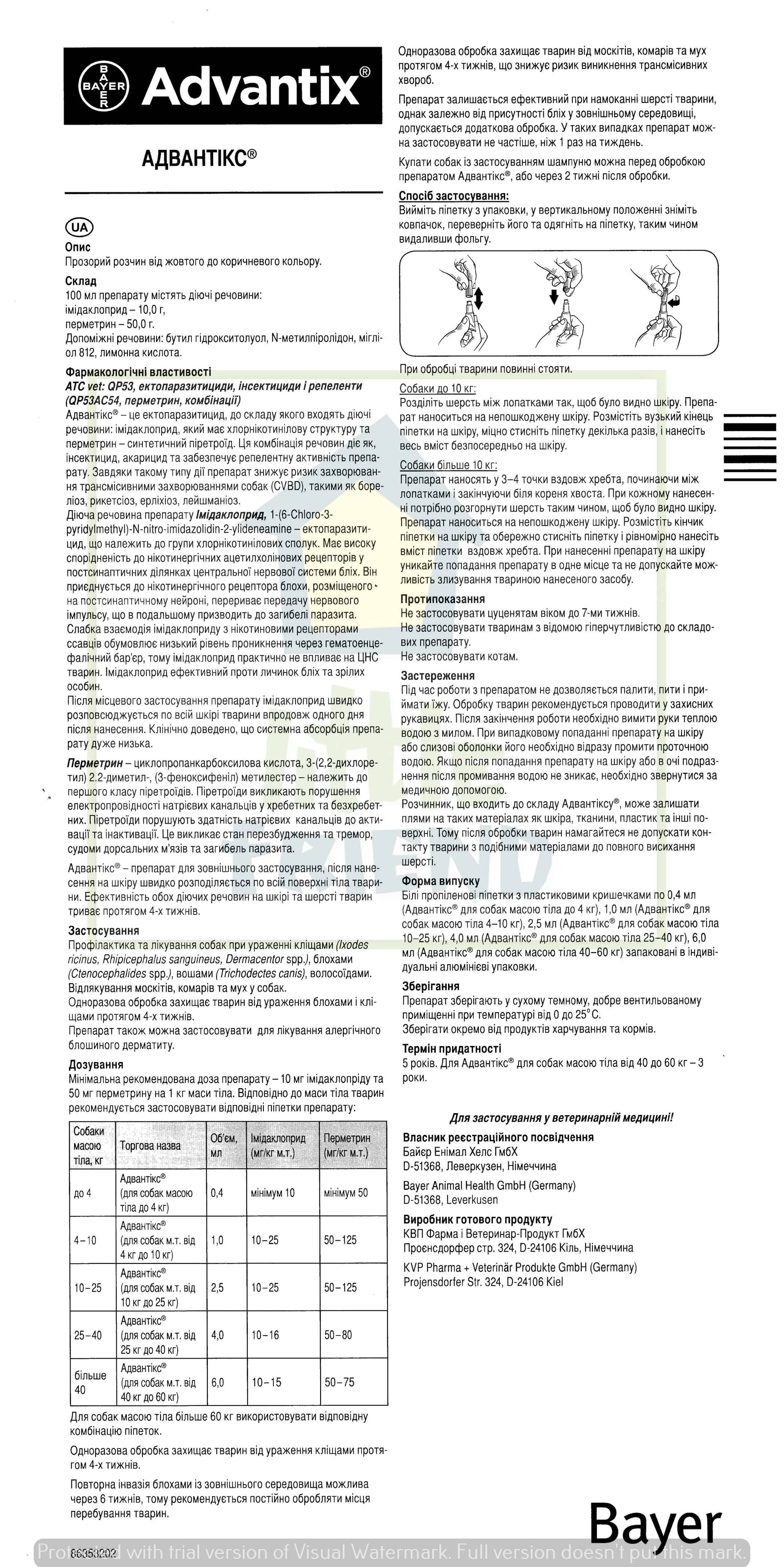Профілактика и лікування собак при враженні Кліщами (Ixodes ricinus, Rhipicephalus sanguineus, Dermacentor spp.), Блохами (Ctenocephalides spp.), Вошами (Trichodectes canis), волосоїдами. Забезпечує захист від нападу кліщів, бліх комарів, москітів та мух протягом 4 тижнів. Ефективний при лікуванні алергічного блошиного дерматиту. Дозволено до застосування вагітним та лактуючим самкам.