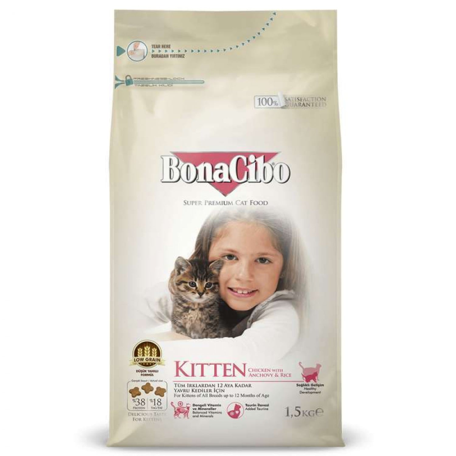 Сухий корм супер преміум класу з м'ясом курки, анчоусами та рисом для котенят всіх порід до 12-ти місяців. BonaCibo Kitten містить оптимальний баланс протеїнів, жирів та вуглеводів, необхідних для здорового розвитку. Раціон збагачений омега-3 жирними кислотами, есенціальними вітамінами та мінералами, які сприяють здоровому метаболізму та забезпечують правильний розвиток кісток.