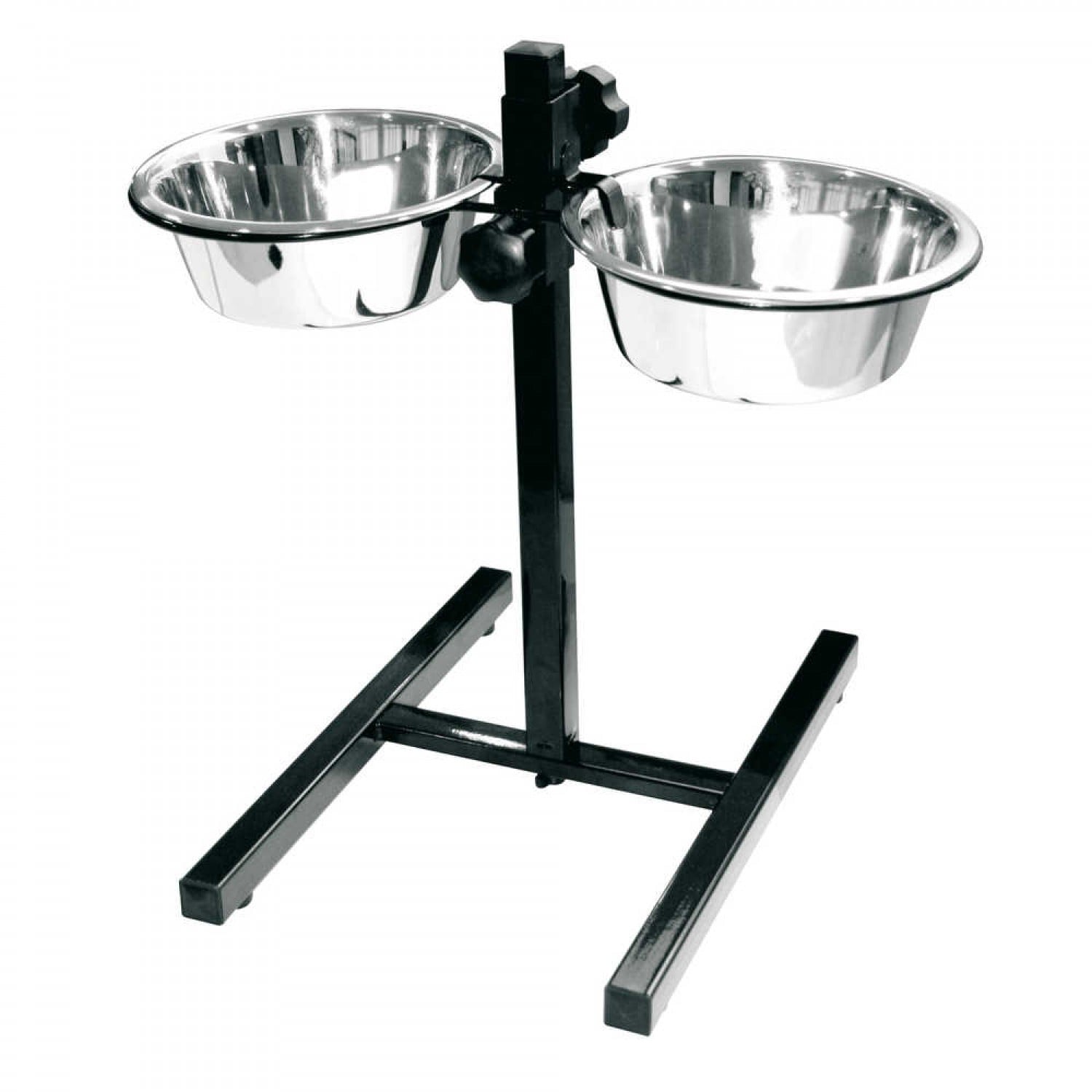На даний момент широку популярність придбали підставки з мисками. Цей аксесуар дозволяє регулювати висоту розташування мисок, є міцною і стійкою конструкцією. У комплекті входять 2 нержавіючі миски та чорна металева підставка. Підходе для собак великих порід.