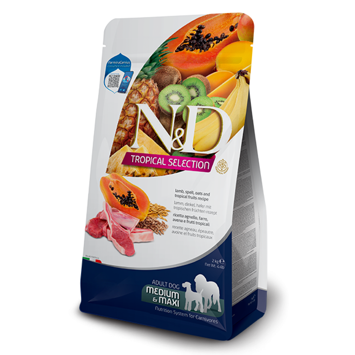 Farmina N&D Tropical Selection Dog Adult Medium & Maxi Lamb, Spelt, Oats & Fruits сухий корм для собак середніх та великих порід з ягням, спельтою, вівсом і тропічними фруктам.