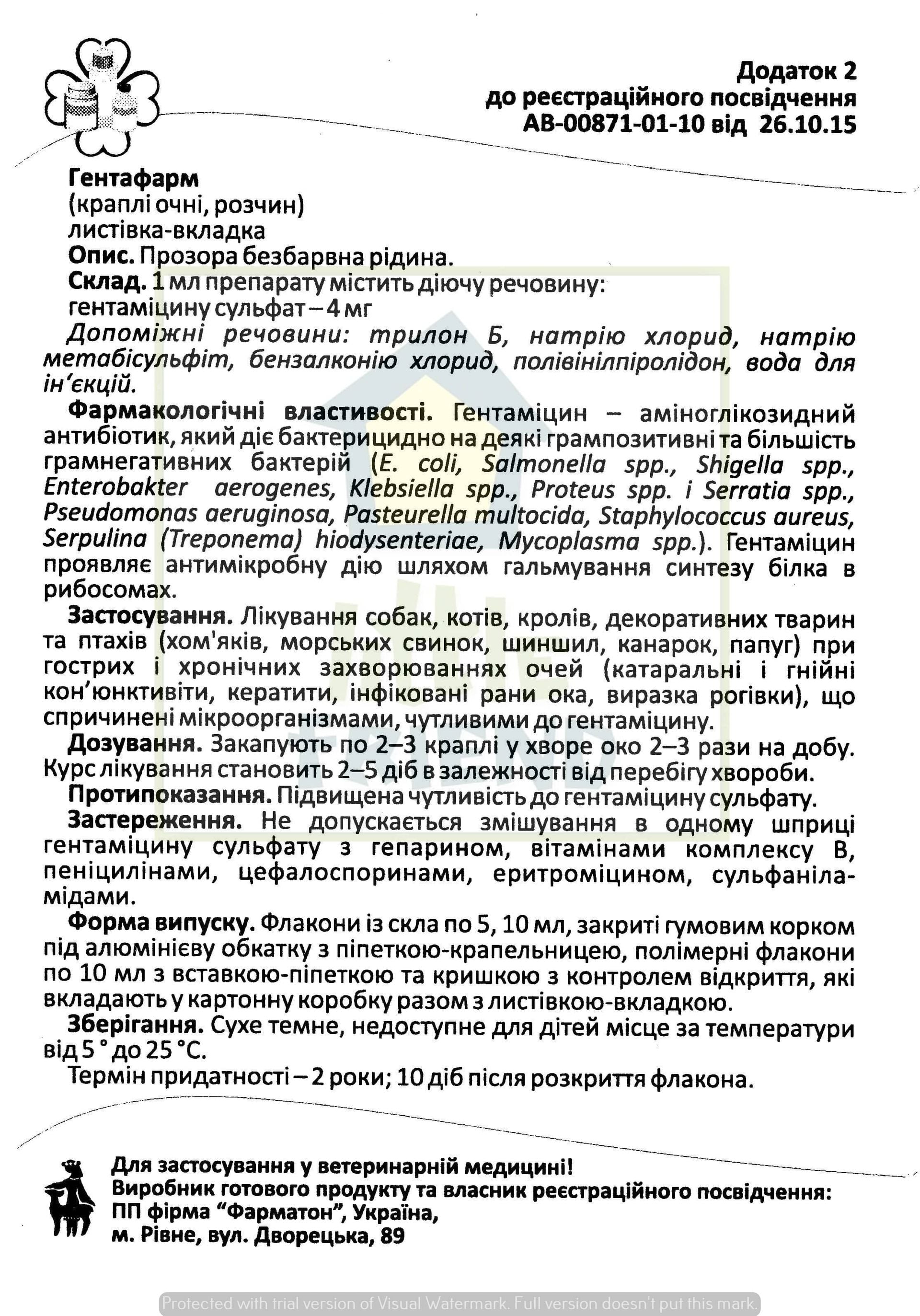 Лікування собак, котів, кролів, декоративних тварин та птахів (хом'яків, морських свинок, шиншил, канарок, папуг) при гострих і хронічних захворюваннях очей (катаральні і гнійні кон’юнктивіти, кератити, інфіковані рани ока, виразка рогівки), що спричинені мікроорганізмами, чутливими до гентаміцину.