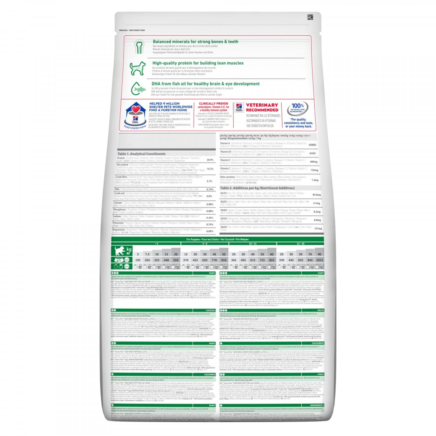Містить збалансований рівень мінералів, необхідний для забезпечення міцності кісток і зубів, оскільки розвиток скелету особливо важливий при зростанні цуценят великих порід.