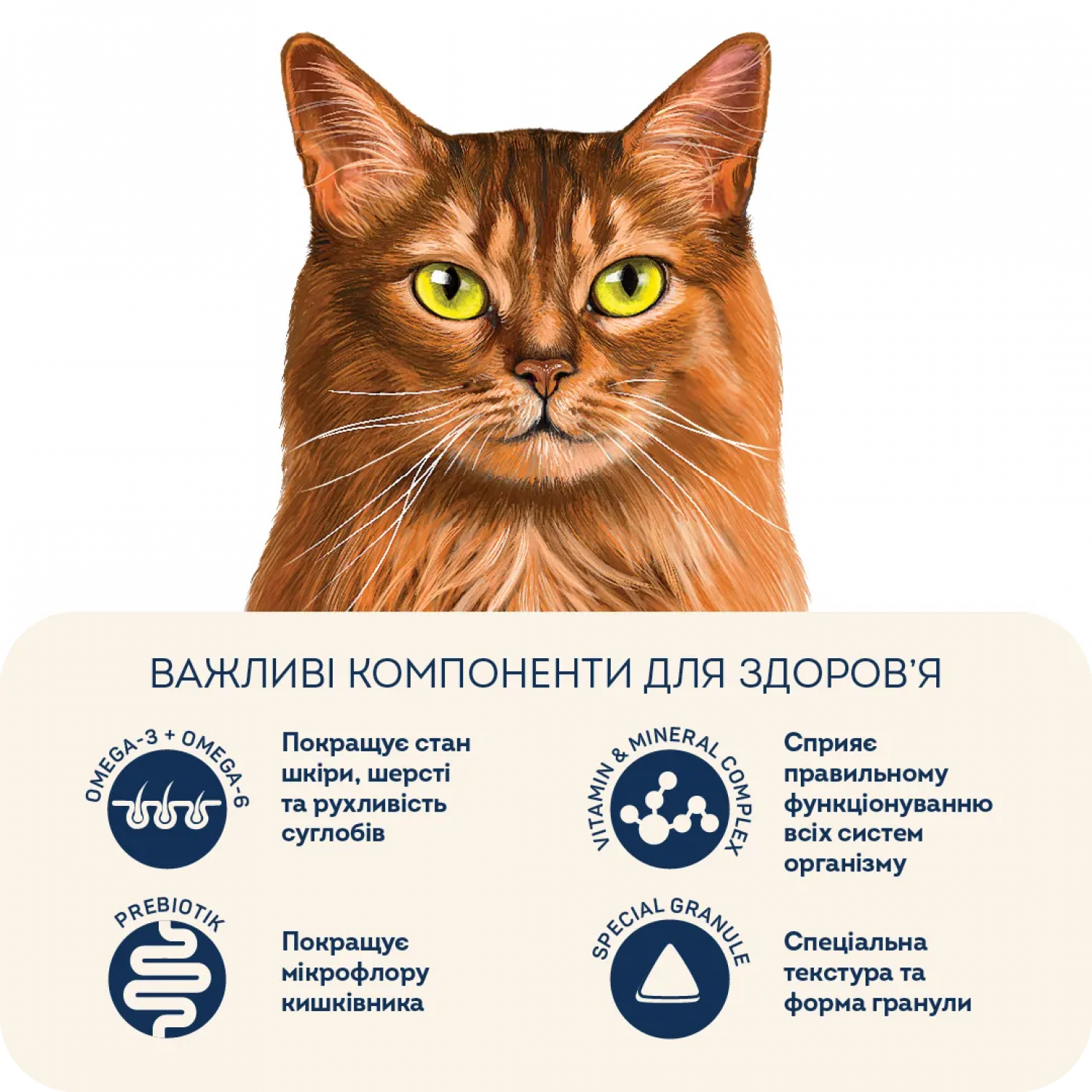 Корм забезпечує насичений блиск шерсті, тому ідеально підходить для котів з яскравим забарвленням та довгошерстим породам.