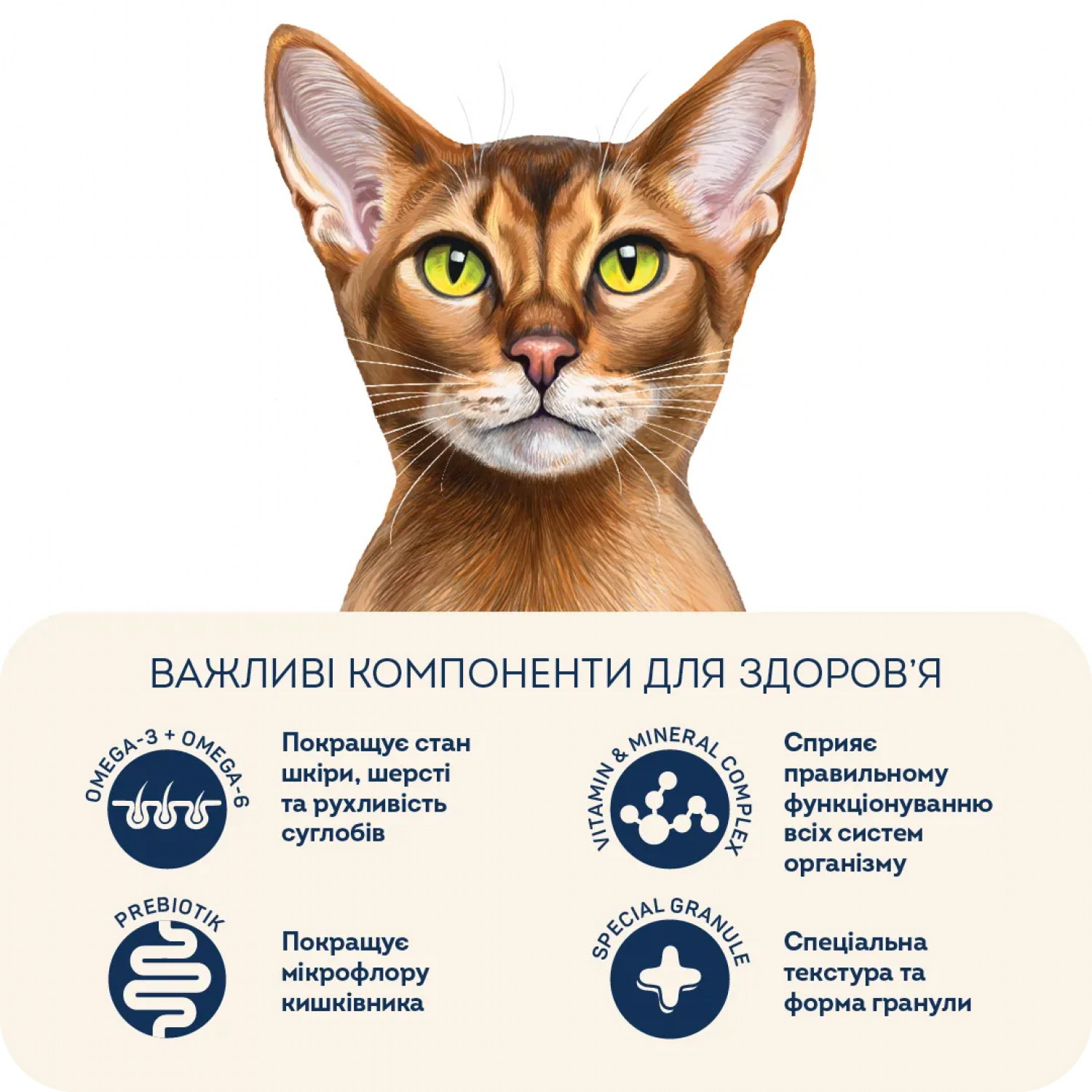 - Корм не містить зернової групи (кукурудза, пшениця, овес), тому є ідеальним вибором для котиків з непереносимістю цієї складової.