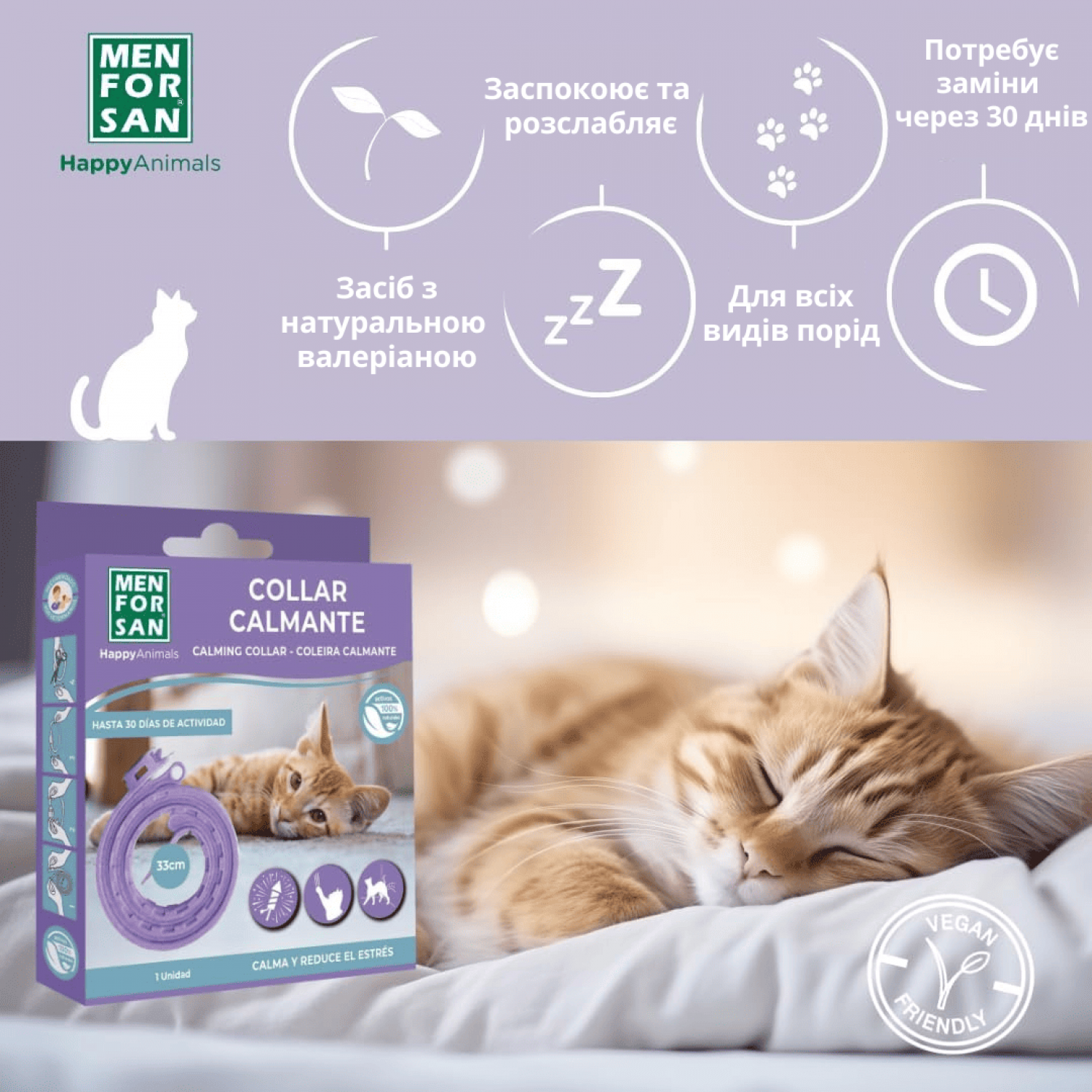 Також дуже корисний для зменшення занепокоєння під час поїздок на автомобілі, візитів до ветеринара, а також зміни розпорядку дня або нових членів сім’ї.