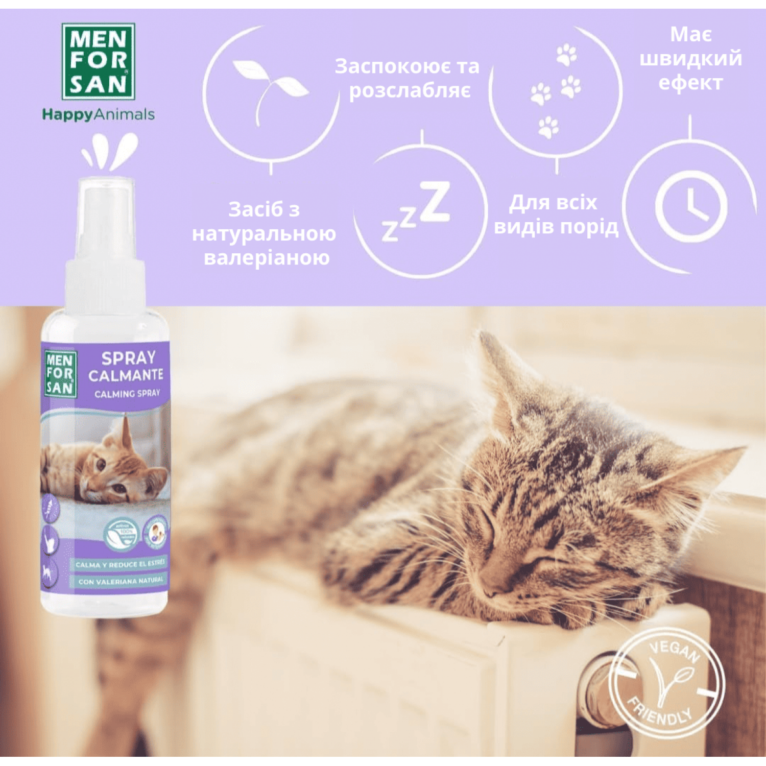 Заспокійливий антистрес спрей для котів з валеріаною. Природне рішення для контролю та зменшення тривоги та стресу, допомагає контролювати небажані поведінкові проблеми у котів. ВАЛЕРІАНА приносить бадьорість і благополуччя. Він легко розпилюється в навколишнє середовище і має моментальний ефект. Запобігає поганій поведінці, такій як надмірне дряпання в небажаних місцях або постійне нявкання, мітки сечею. Дуже дієвий для візитів до ветеринара або переїзду в незнайоме оточення, нового члена в домі або інших стресових ситуацій.
