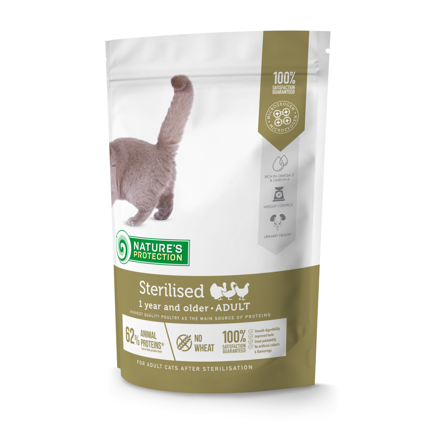 Nature's Protection Sterilised Adult – повнораціонний сухий корм для дорослих стерилізованих кішок та кастрованих котів. Оптимально збалансована формула корму зі зниженою кількістю жирів та L-карнітином допомагає врегулювати вагу та перешкоджає подальшому накопиченню надлишкової маси тіла Вашого вихованця.