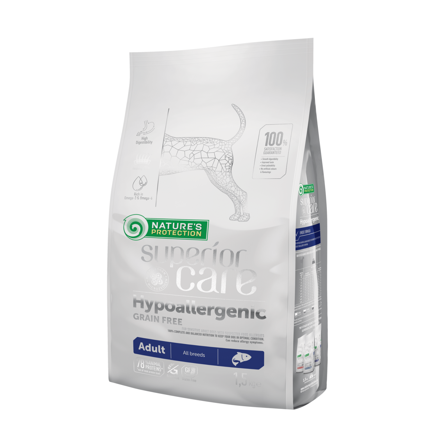 Nature's Protection Superior Care Hypoallergenic Grain Free - повнораціонний беззерновий гіпоалергенний корм супер преміум класу, призначений для дорослих собак усіх порід з чутливою системою травлення. Основне джерело білку в кормі - високоякісний лосось з Норвегії, в складі якого багато особливо корисних амінокислот Омега-3, що дбають про шкіру і шерсть вашого вихованця. Раціон повністю задовольняє потреби організму дорослого собаки в поживних речовинах, позитивно впливає на загальне здоров'я вихованця, легко засвоюється та має приємний для тварини смак.