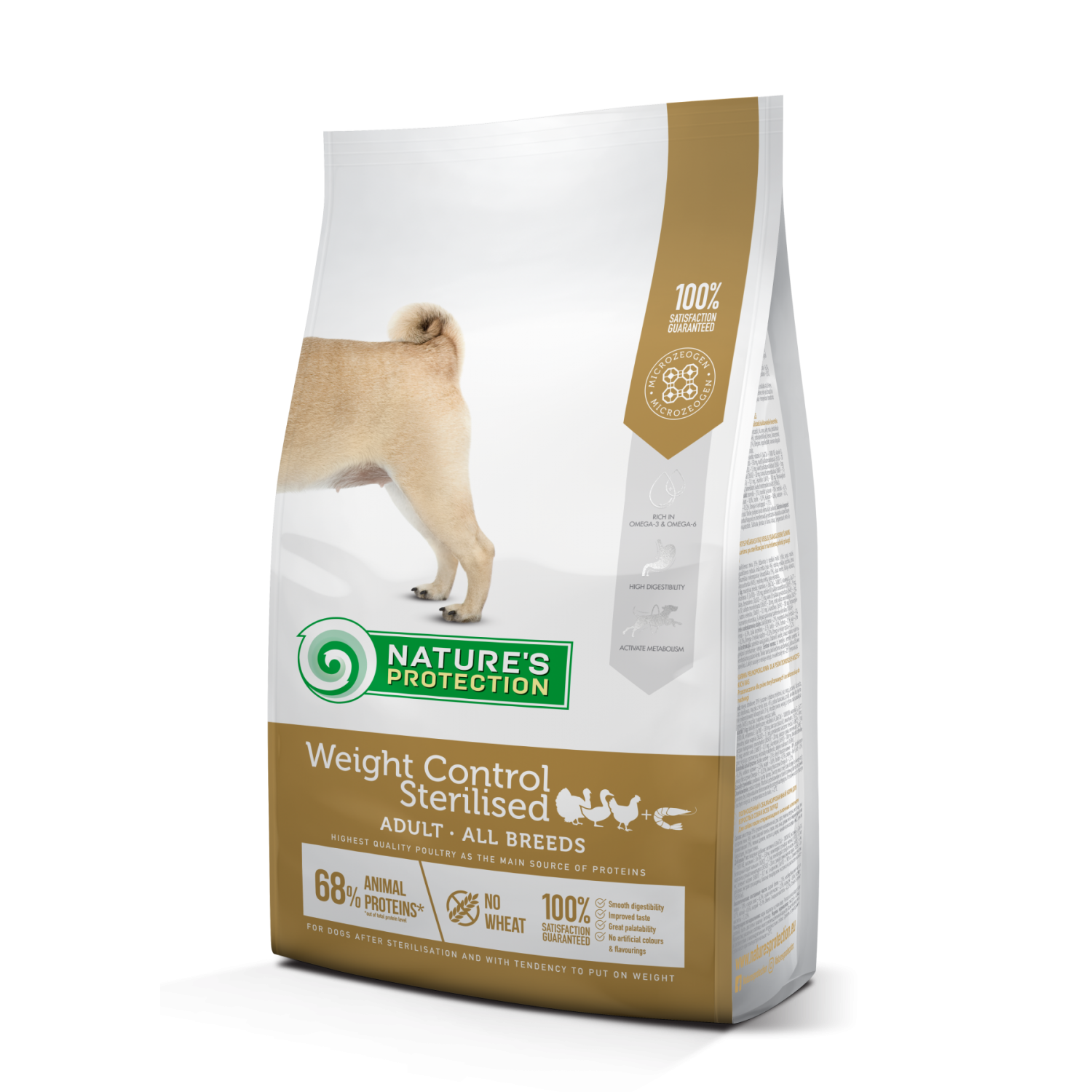 Повнораціонний сухий корм Nature's Protection Weight Control Sterilised дозволяє повністю задовольнити потреби організму дорослої стерилізованої, або схильної до надмірної ваги собаки в поживних речовинах, легко засвоюється та має приємний для тварини смак.