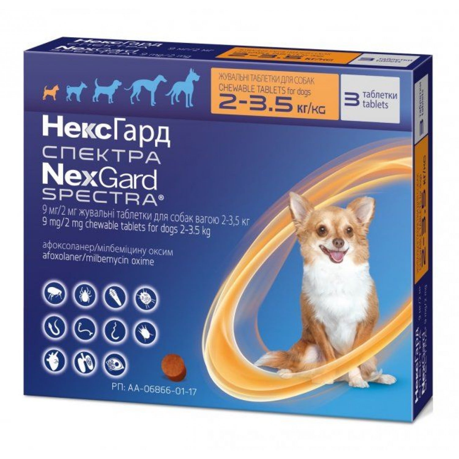 Комбінований протипаразитарний препарат у вигляді жувальних таблеток зі смаком яловичини для собак, вагою від 2 до 3,5 кг. Захищає улюбленця від бліх, іксодових і шкірних кліщів, шлунково-кишкових нематод і личинок дірофілярій на термін до 1 місяця.