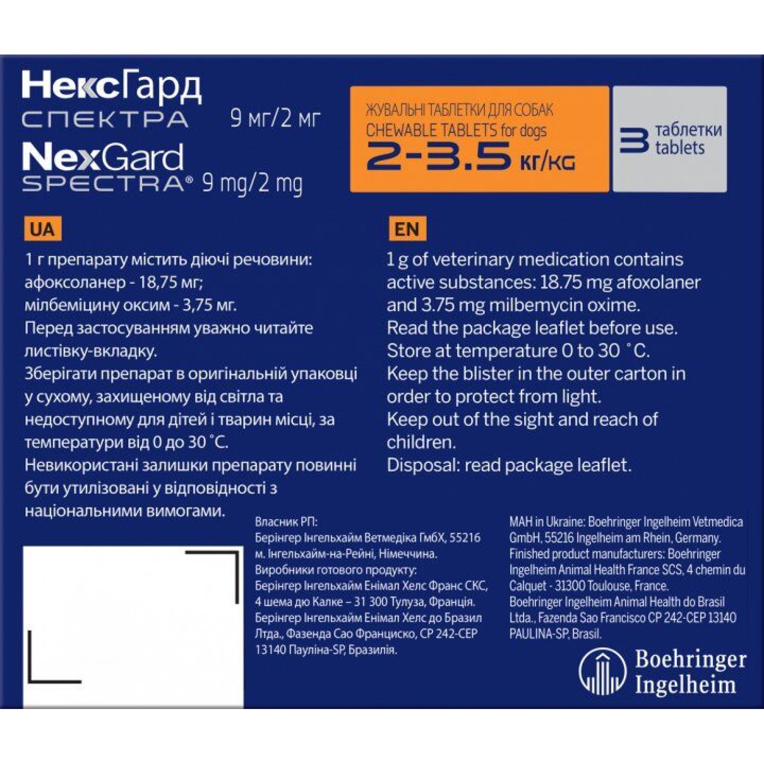 - 1 таблетка для собак, вагою від 2 до 3,5 кг містить 9,4 мг афоксоланера і 1,9 мг мільбеміцину оксиму. Маса таблетки 0,5 грама