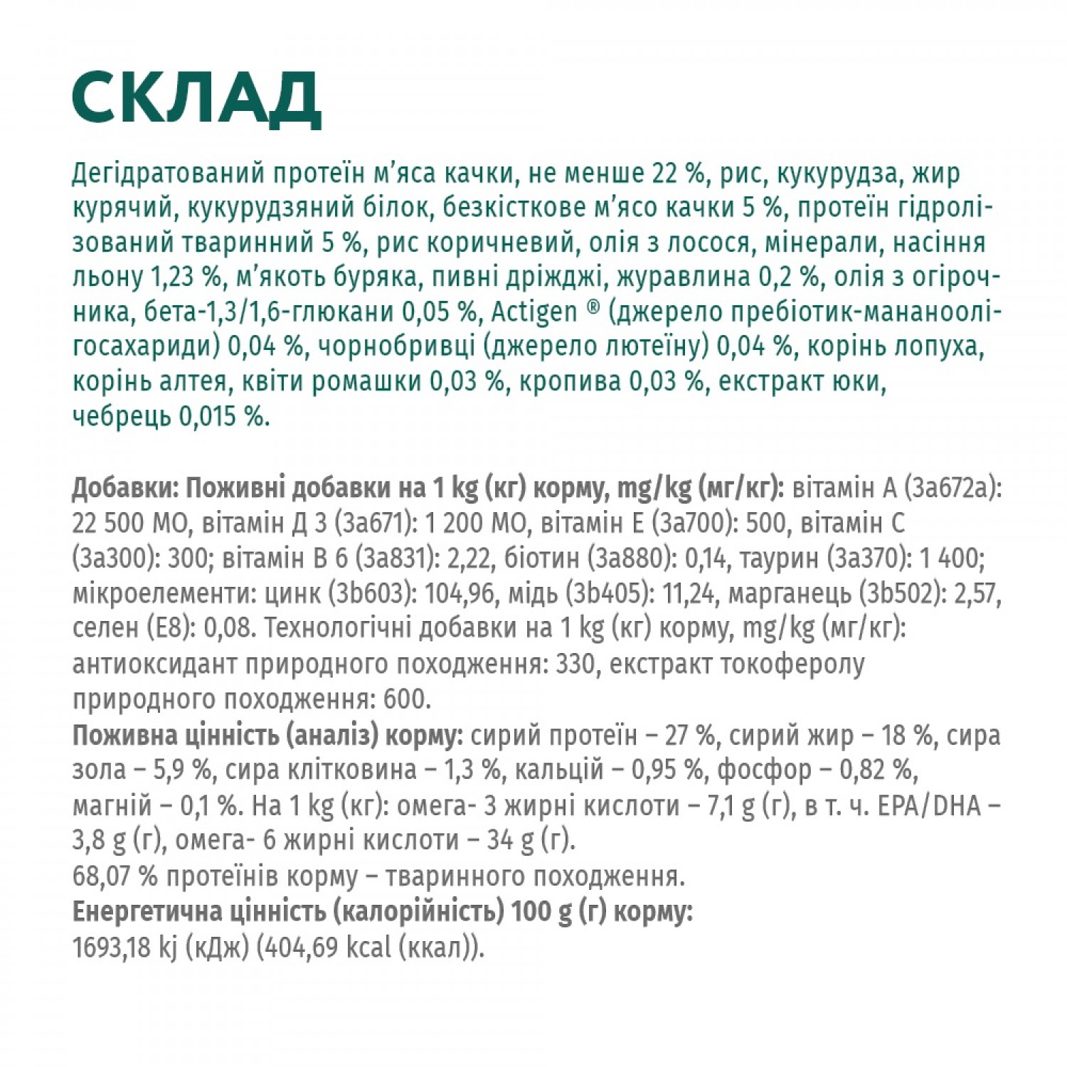 Гранули корму відрізняються спеціальною текстурою, яка допомагає очищати зуби від нальоту та підтримувати чистоту порожнини рота тварини. М'ясо качки – якісний протеїн, який легко засвоюється та забезпечує тварині підтримку м'язової маси та оптимальної ваги. Протеїн у складі корму становить 68,07% – це дуже високий показник, і саме такий відсоток протеїну потрібний собакам малих порід.
