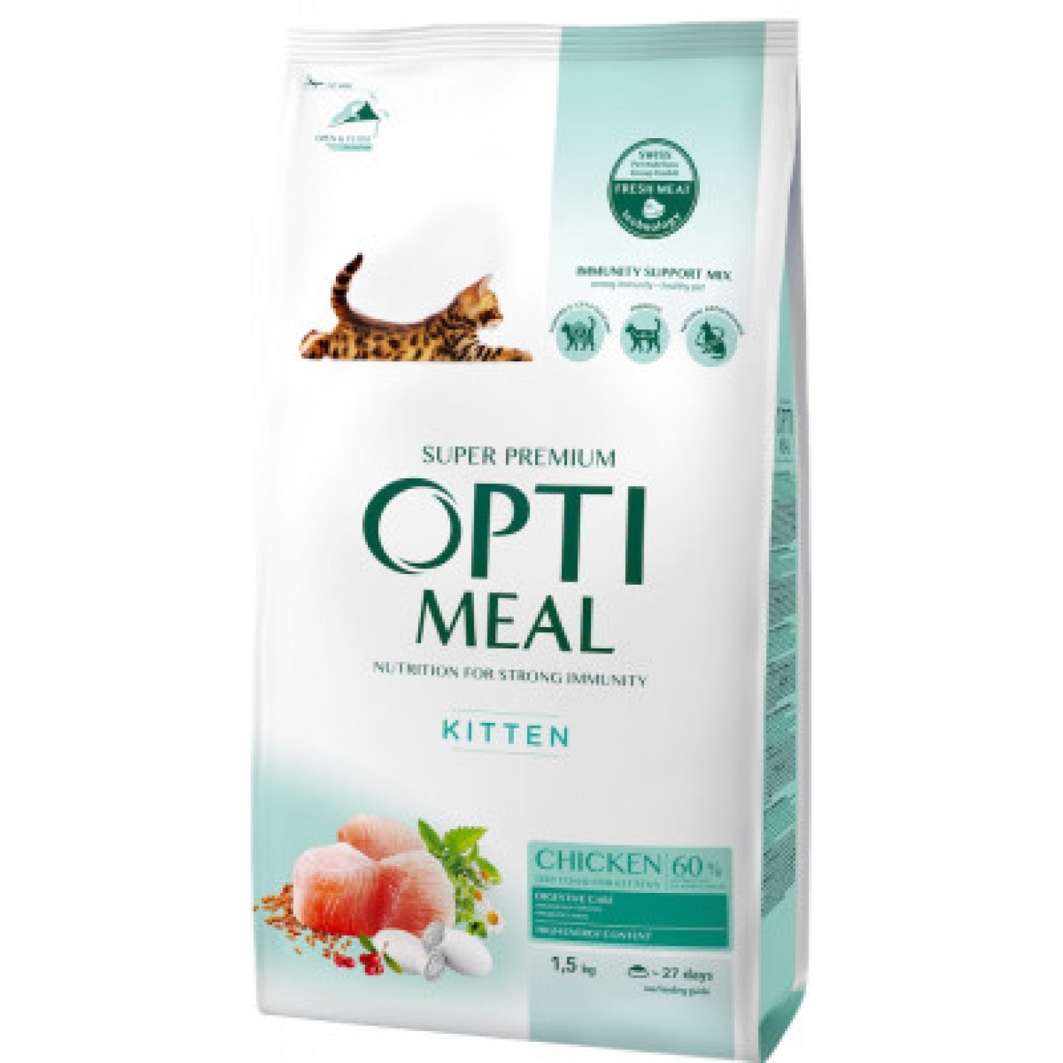 Optimeal Kittens Chicken – повноцінний сухий корм для кошенят суперпреміум класу. Корм підвищує імунітет, містить легкозасвоювані білки та пребіотики, які покращують травлення. Optimeal для кошенят має оптимальне співвідношення кальцію, фосфору та вітаміну D, що забезпечують здорове зростання кошеняти.