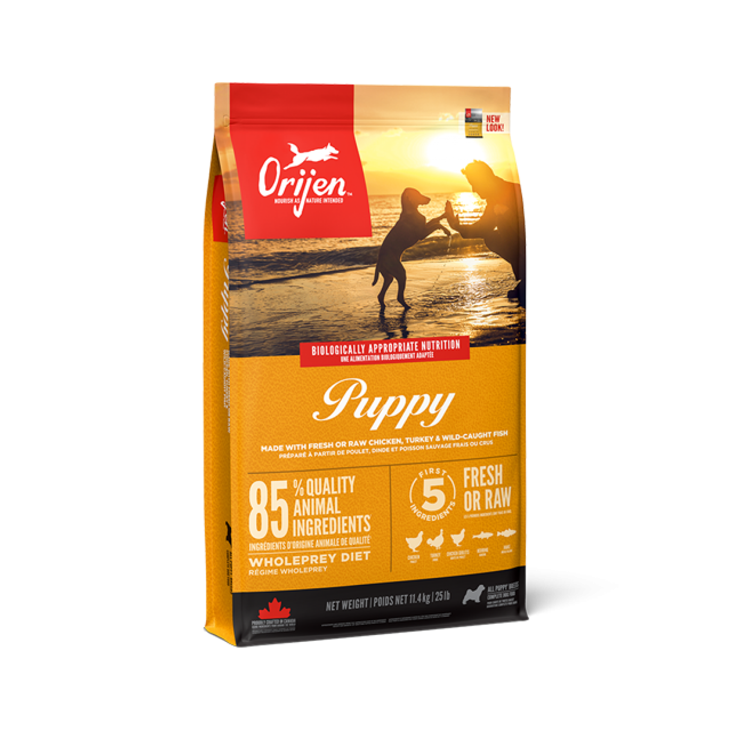 Цуценятам необхідні високопротеїнові раціони з високим вмістом білків та жиру з різноманітних видів свіжого цільного м’яса, для підтримки швидкого зростання та розвитку. Переповнений високопоживними протеїнами (38%), з меншою кількістю вуглеводів (17%), ORIJEN забезпечує природне харчування цуценят у відповідності до їх еволюційних та біологічних потреб. Не йдучи в порівняння з жодним кормом для цуценят, 2/3 м’ясних інгредієнтів у складі корму ORIJEN являються СВІЖИМИ (охолодженими, без додавання консервантів ) або СИРИМИ (миттєво замороженими, без додавання консервантів), включаючи топ 10 інгредієнтів. 1/3 м’ясних інгредієнтів – це м’ясо курчат, індички та риба, висушене при температурі 90°C. Відмінне концентроване джерело високопоживних протеїнів, що необхідні для підтримки цуценят в період зростання.