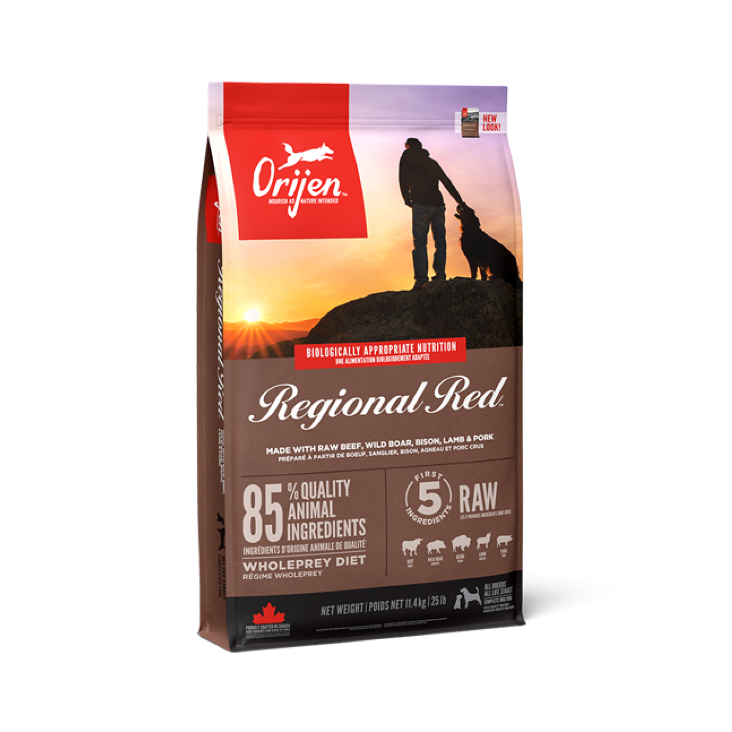Раціон ОРІДЖЕН Регіонал Ред забезпечує вашого собаку високопоживними протеїнами та нутрієнтами, яких вони потребують зі свіжих або сирих інгредієнтів, таких як м’ясо бичків, дикого кабана, бізона, ягняти та свинина. Раціон ORIJEN Regional Red виготовлений з найбільш поживних та соковитих частин здобичі, представлених м’язовим м’ясом, високопоживними органами та їстівними кістками у співвідношенні WholePrey, забезпечуючи собакам харчування, якого вони потребують. Раціон що складається з 85% якісних м’ясних інгредієнтів та гранули покриті ліофілізованою печінкою, цей раціон поза будь-якими порівняннями.