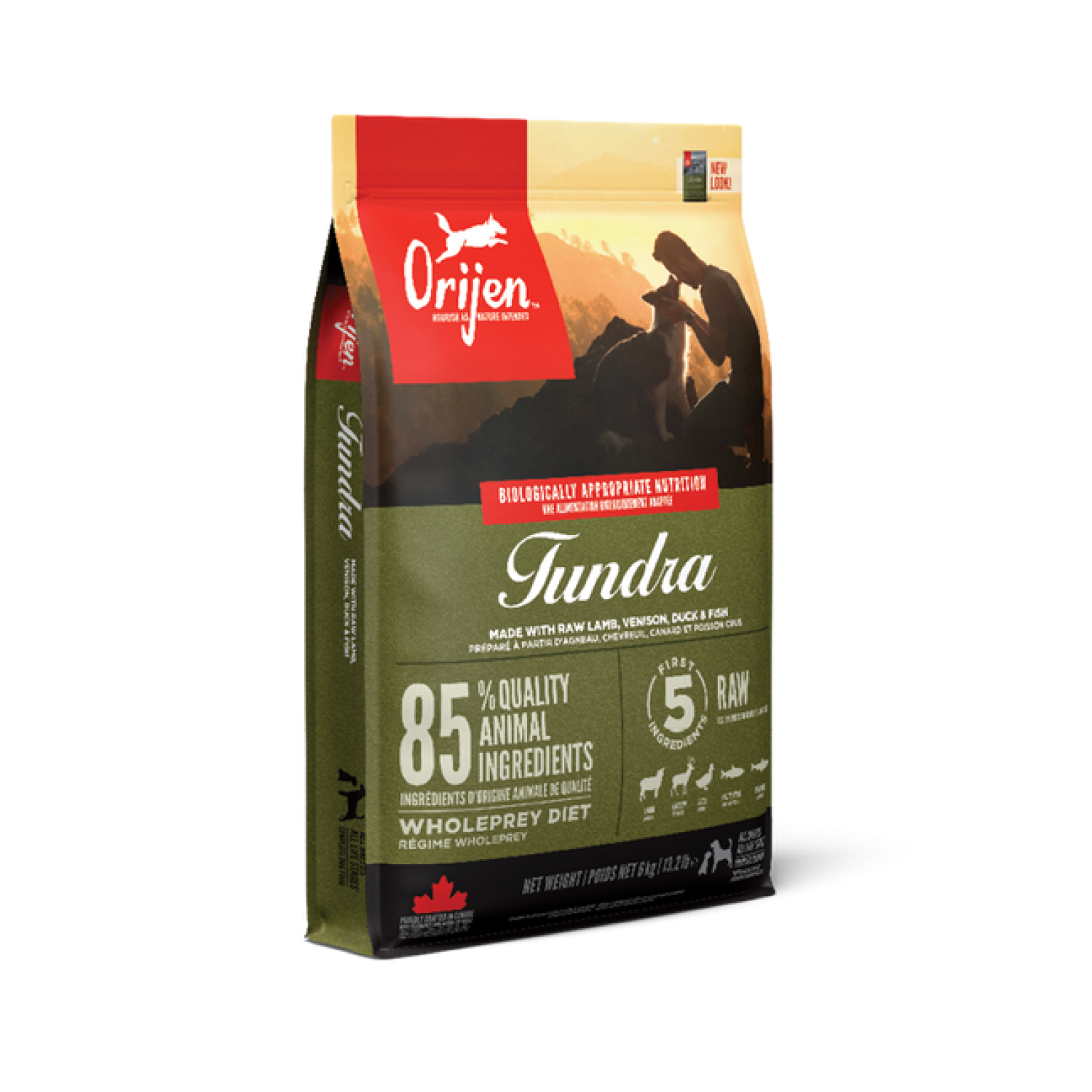 Раціон ОРІДЖЕН Тундра забезпечує вашого собаку високопоживним протеїнами та нутрієнтами, яких вони потребують зі свіжих або сирих інгредієнтів, таких як качка, риба або оленина. Раціон ОРІДЖЕН Тундра виготовлений з найбільш поживних та соковитих частин здобичі, представлених м’язовим м’ясом, високопоживними органами та їстівними кістками у співвідношенні WholePrey, забезпечуючи собакам харчування, якого вони потребують. Раціон що на 85%складається з якісних м’ясних інгредієнтів, а гранули покриті лофілізованою печінкою, цей раціон поза будь-якими порівняннями.