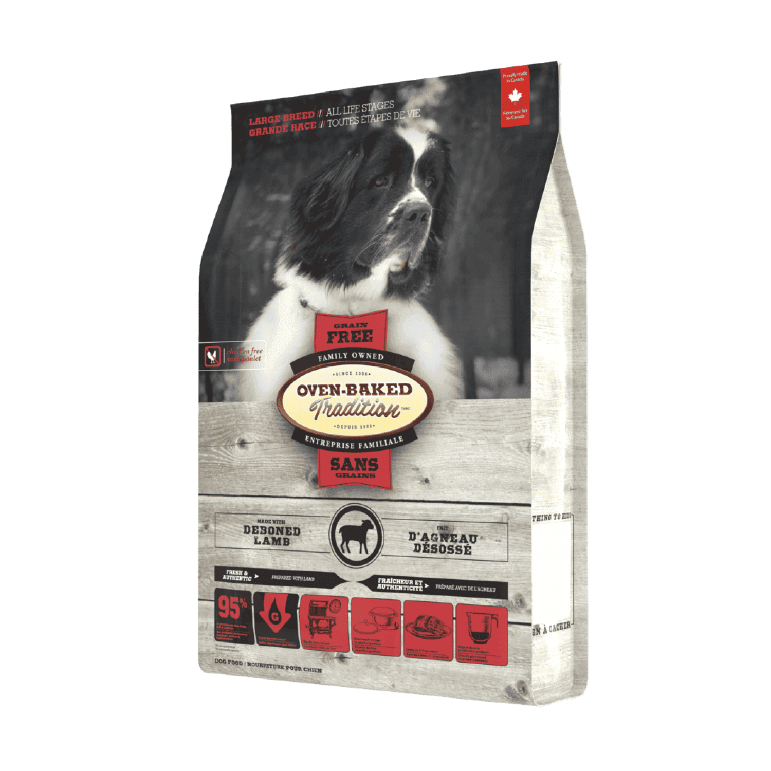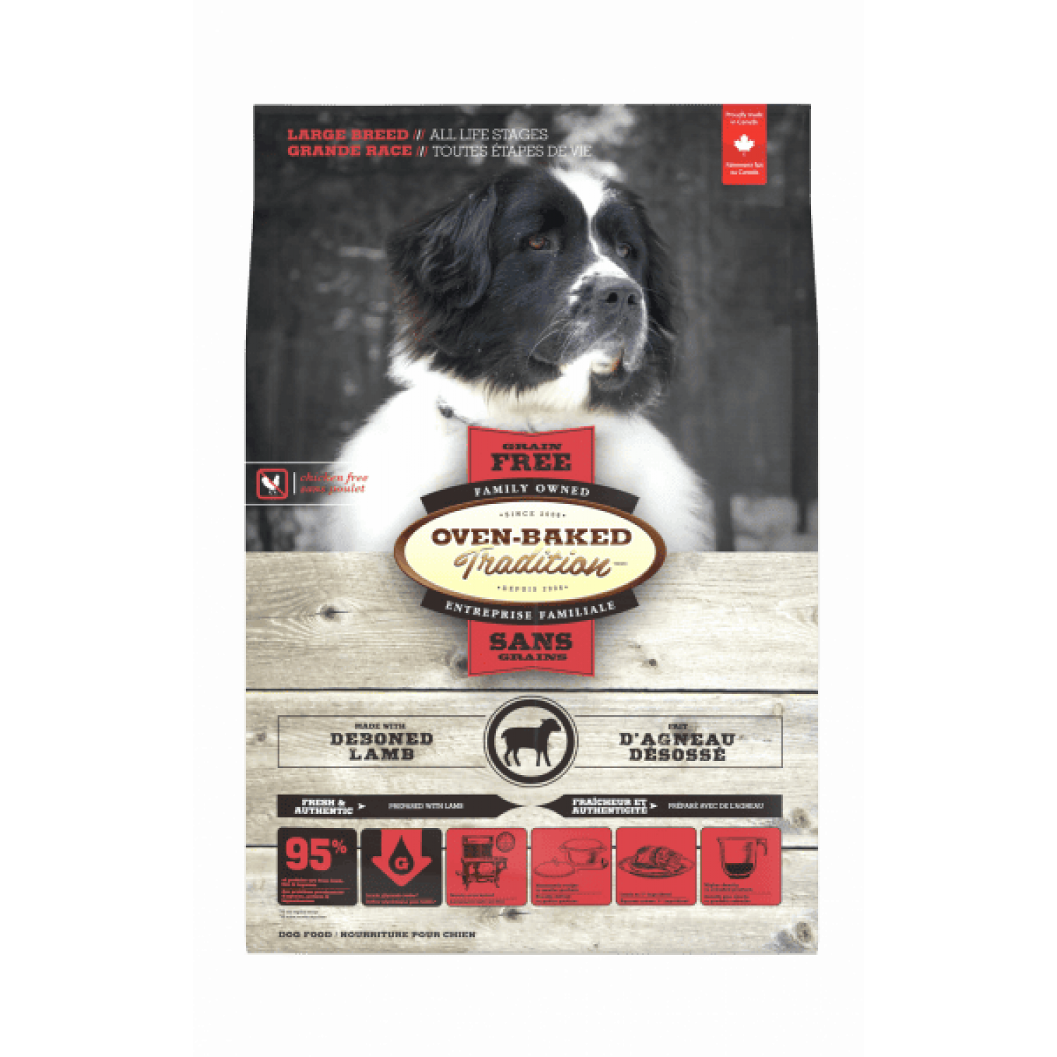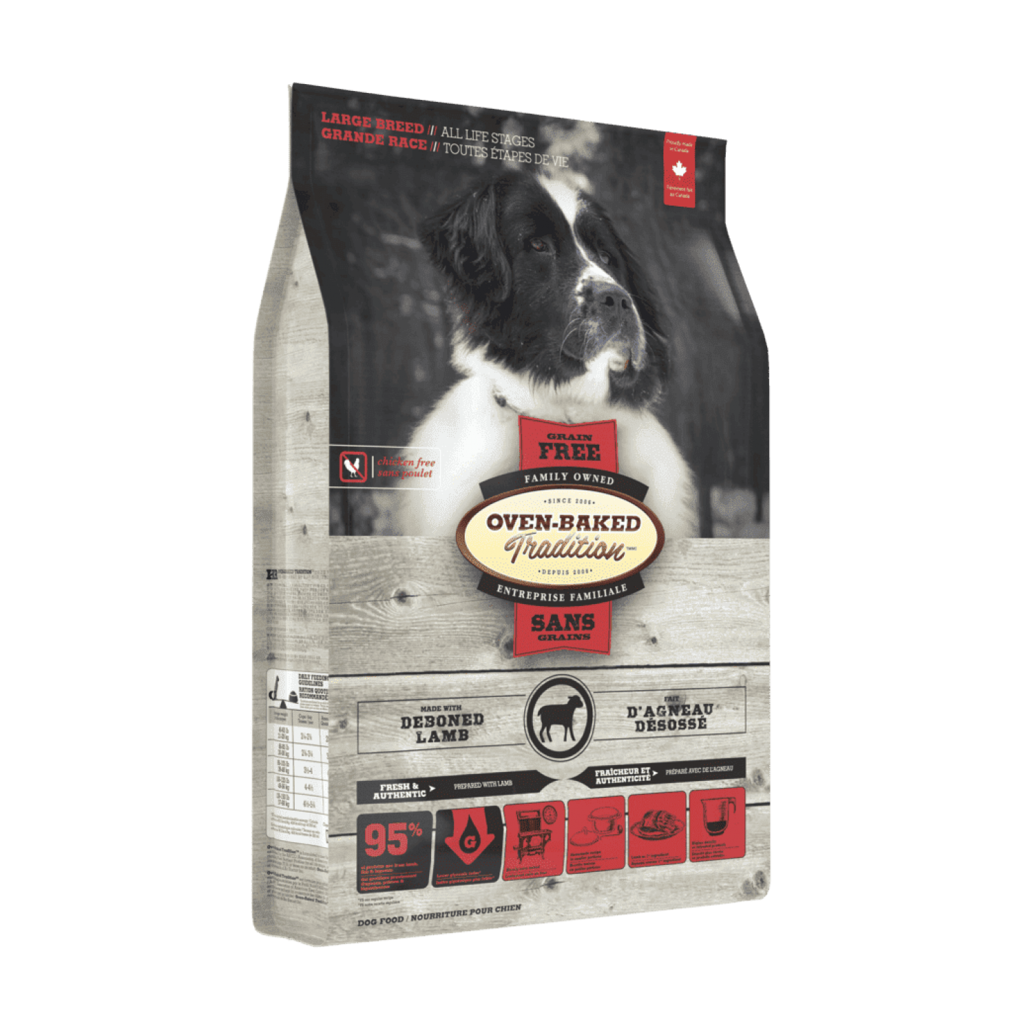 Oven-Baked Tradition повністю збалансований беззерновий сухий корм для собак великих порід усіх етапів життя зі свіжого м’яса ягня.