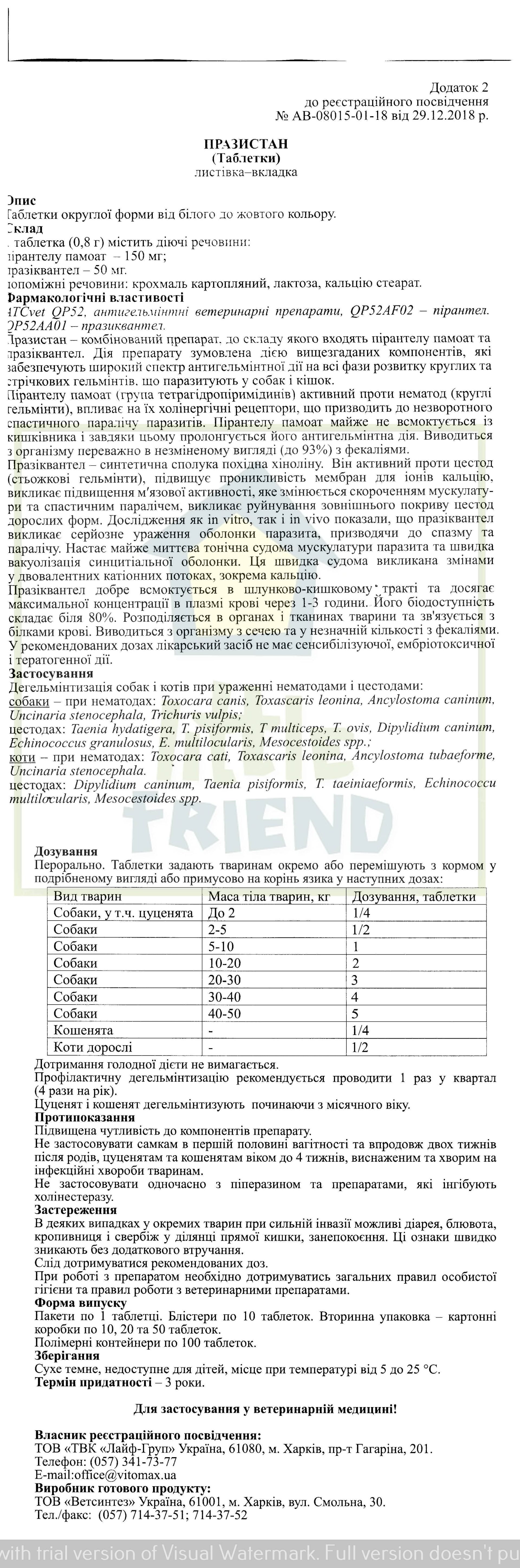 Празистан - комбінований антигельмінтний препарат, до складу якого входять пірантелу памоат і празиквантел. Має широкий спектр антигельмінтної дії для профілактики та лікування при нематодозах (круглі гельмінти) і цестодозах (стьожкові гельмінти), що паразитують у собак та цуценят.