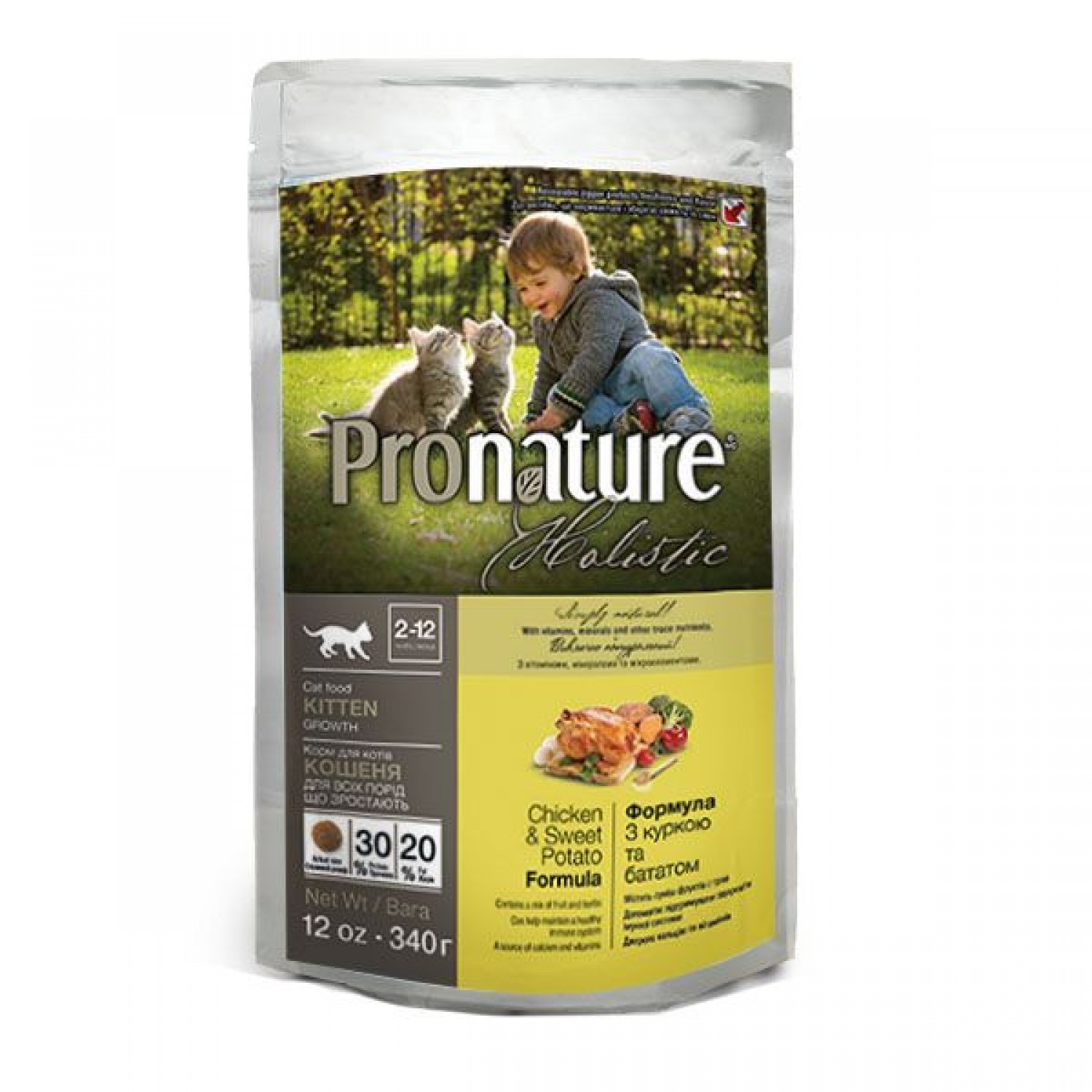 Формула росту для кошенят Pronature Holistic Kitten Chicken & Sweet Potato PRONATURE HOLISTIC з куркою та солодкою картоплею. Сухий холістичний корм для кошенят від 2 до 12 місяців. Унікальна рецептура робить корм для кошенят повноцінним, смачним і сприяє здоров'ю та гармонійному розвитку організму в цілому.