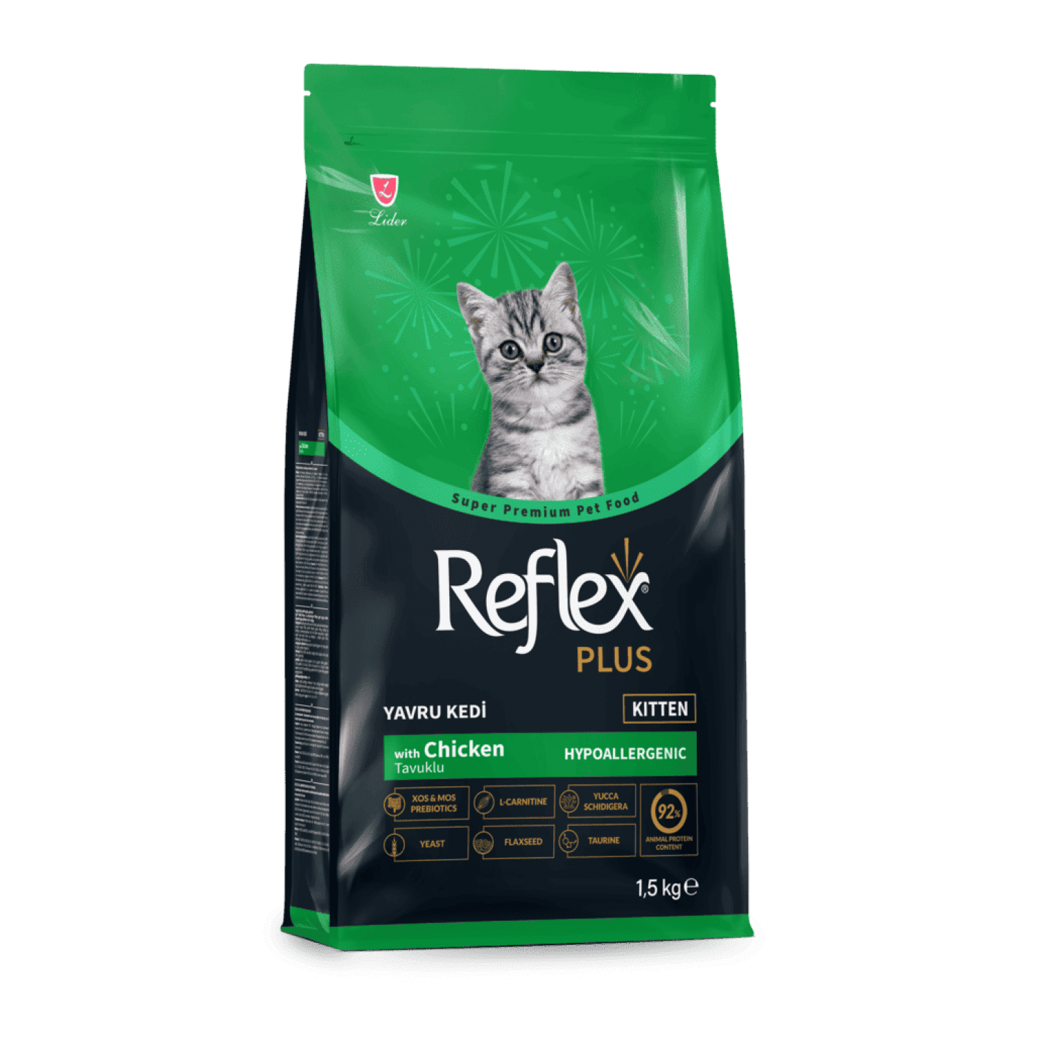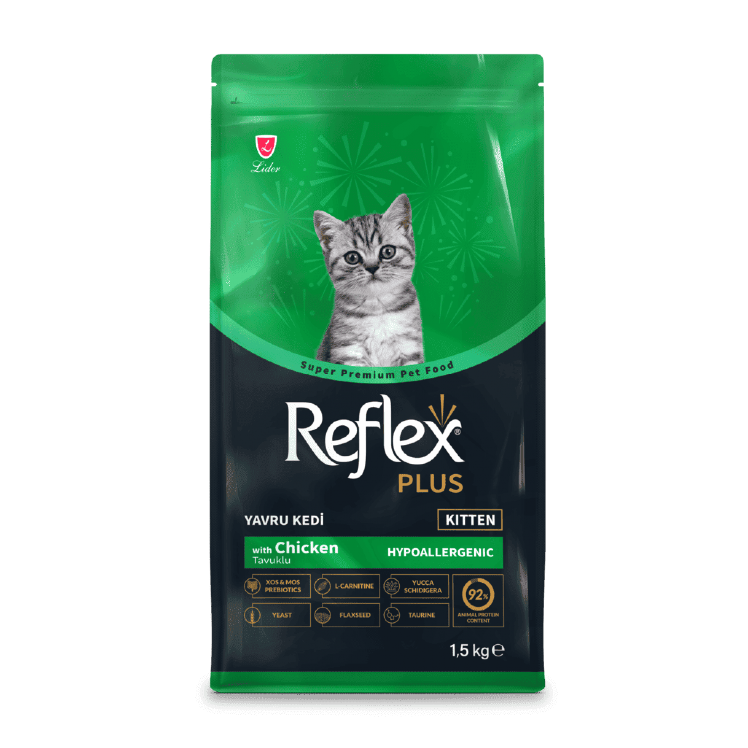 Reflex Plus Kitten для кошенят з куркою - повноцінний і збалансований сухий корм супер-преміум класу, спеціально розроблений для кошенят усіх порід віком від 2 до 12 місяців. Формула з високим вмістом якісного курячого м’яса забезпечує необхідні поживні речовини для здорового росту, розвитку і підтримки імунітету. Reflex Plus підтримує здоров’я травної системи, покращує стан шерсті та сприяє активності вашого улюбленця.
