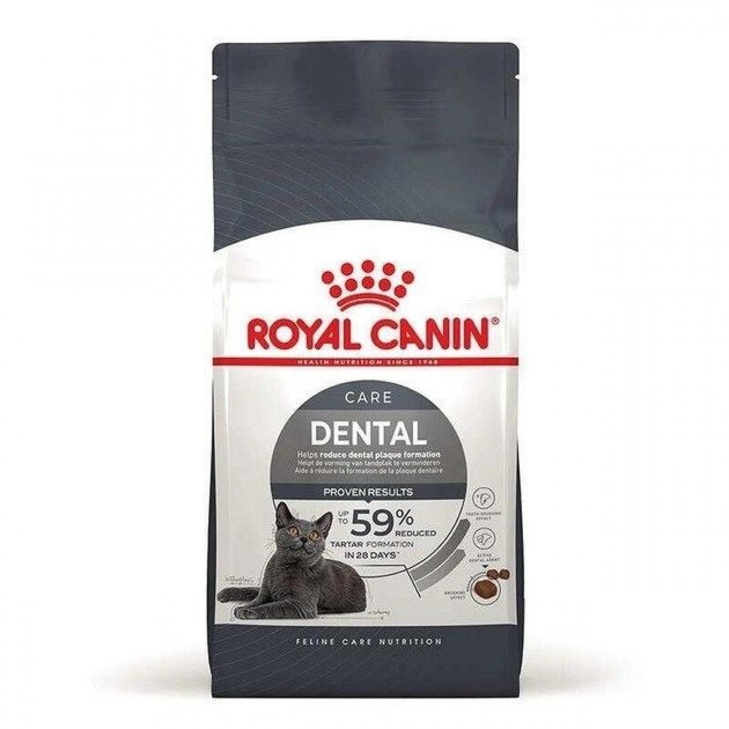 • Доведена ефективність. При вживанні виключно сухого раціону Royal Canin Dental Care через 28 днів утворення зубного каменю знижувалося до 59%.