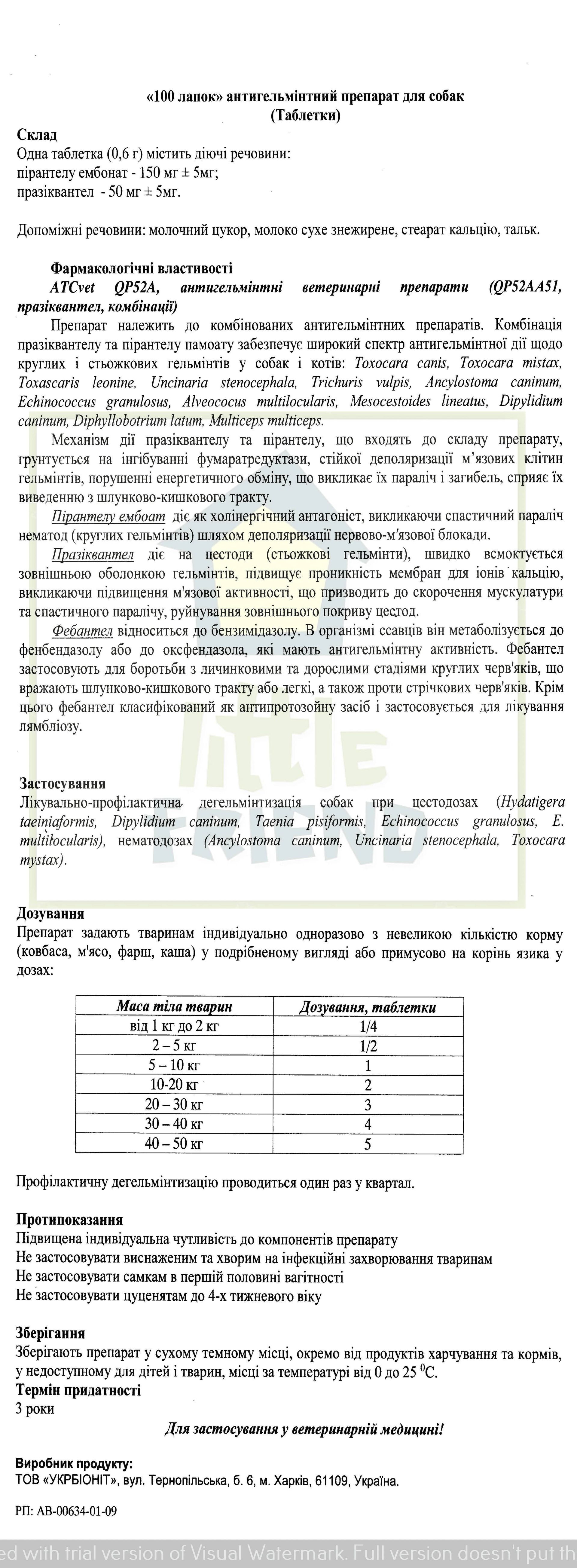 Таблетки 100 Лапок - это комбинированный препарат, в состав которого входят пирантела эмбонат и празиквантел. Действие препарата обусловлено действием этих компонентов, обеспечивающих широкий спектр антигельминтного действия.
