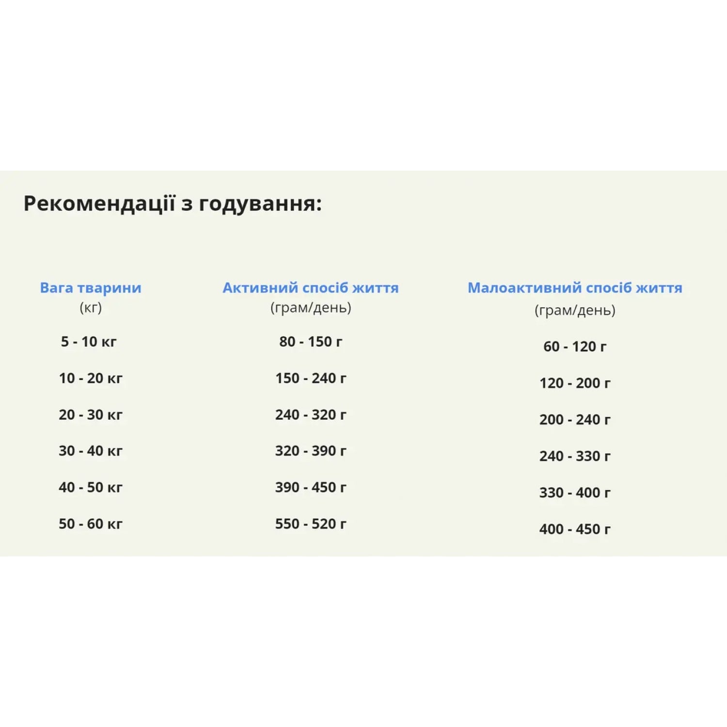 50-60 кг 450-520 г 400-450 г