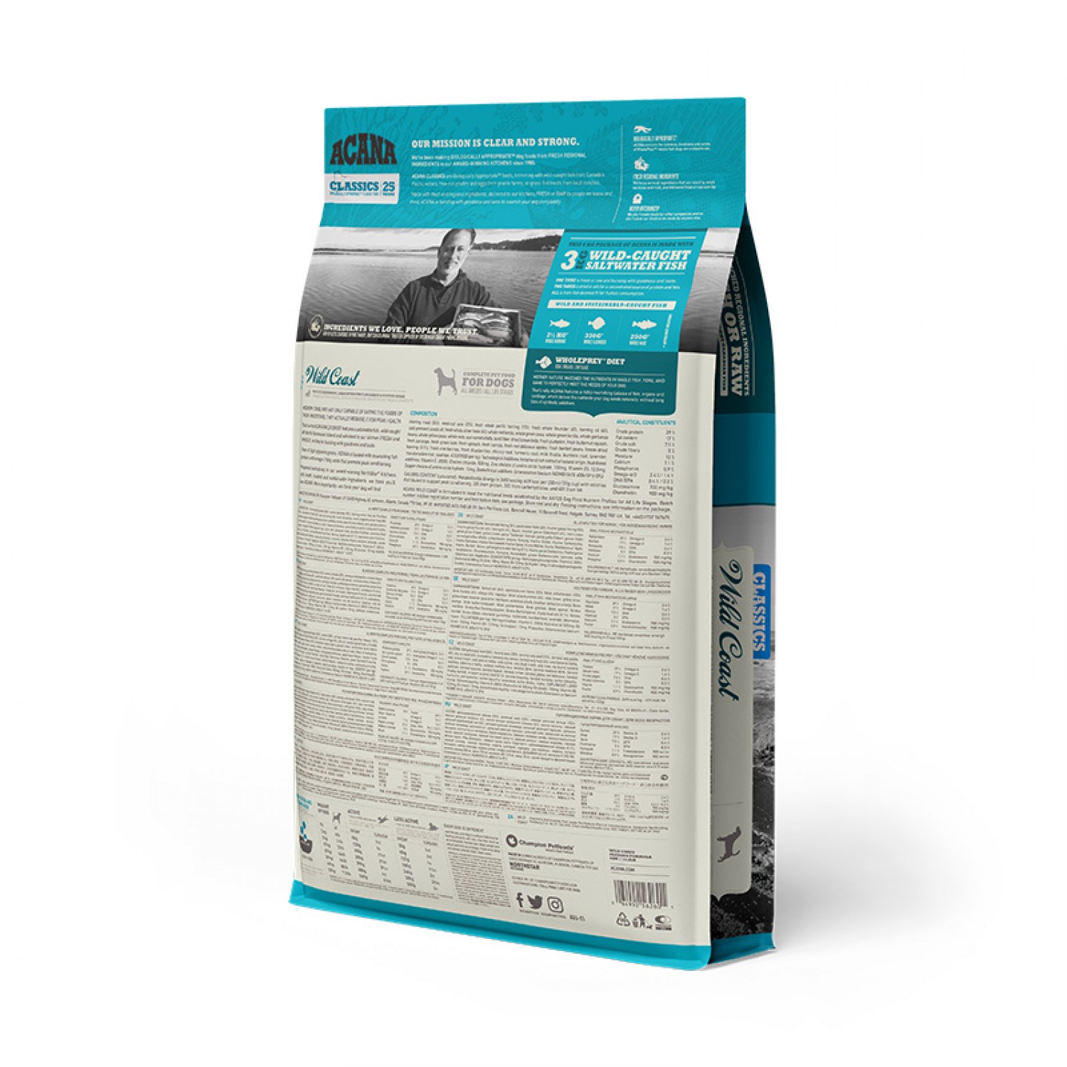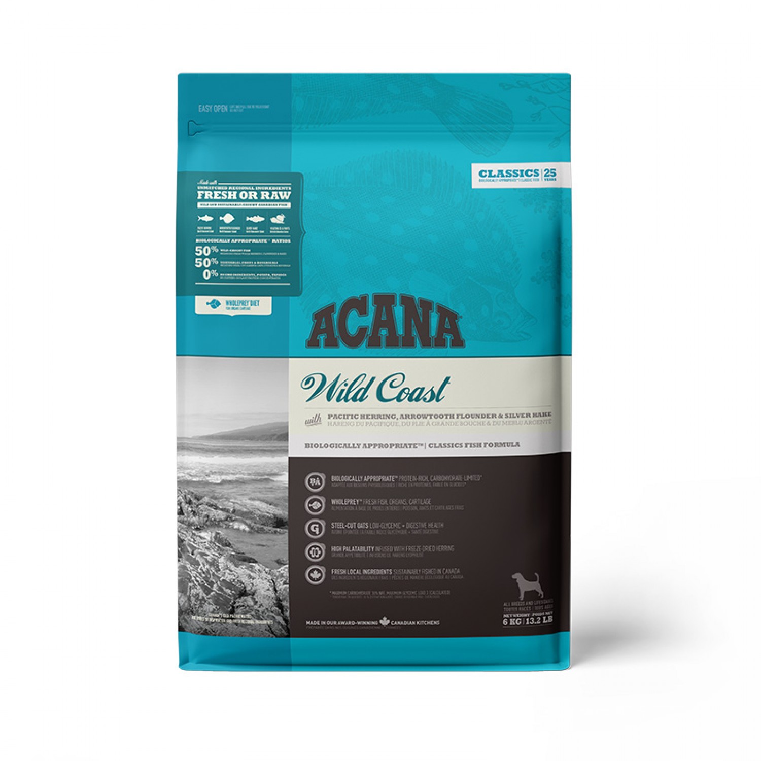 ACANA Wild Coast создан в соответствии с уровнями питательности, установленными FEDIAF для всех стадий жизни, включая собак в период роста (от 30 кг и более).