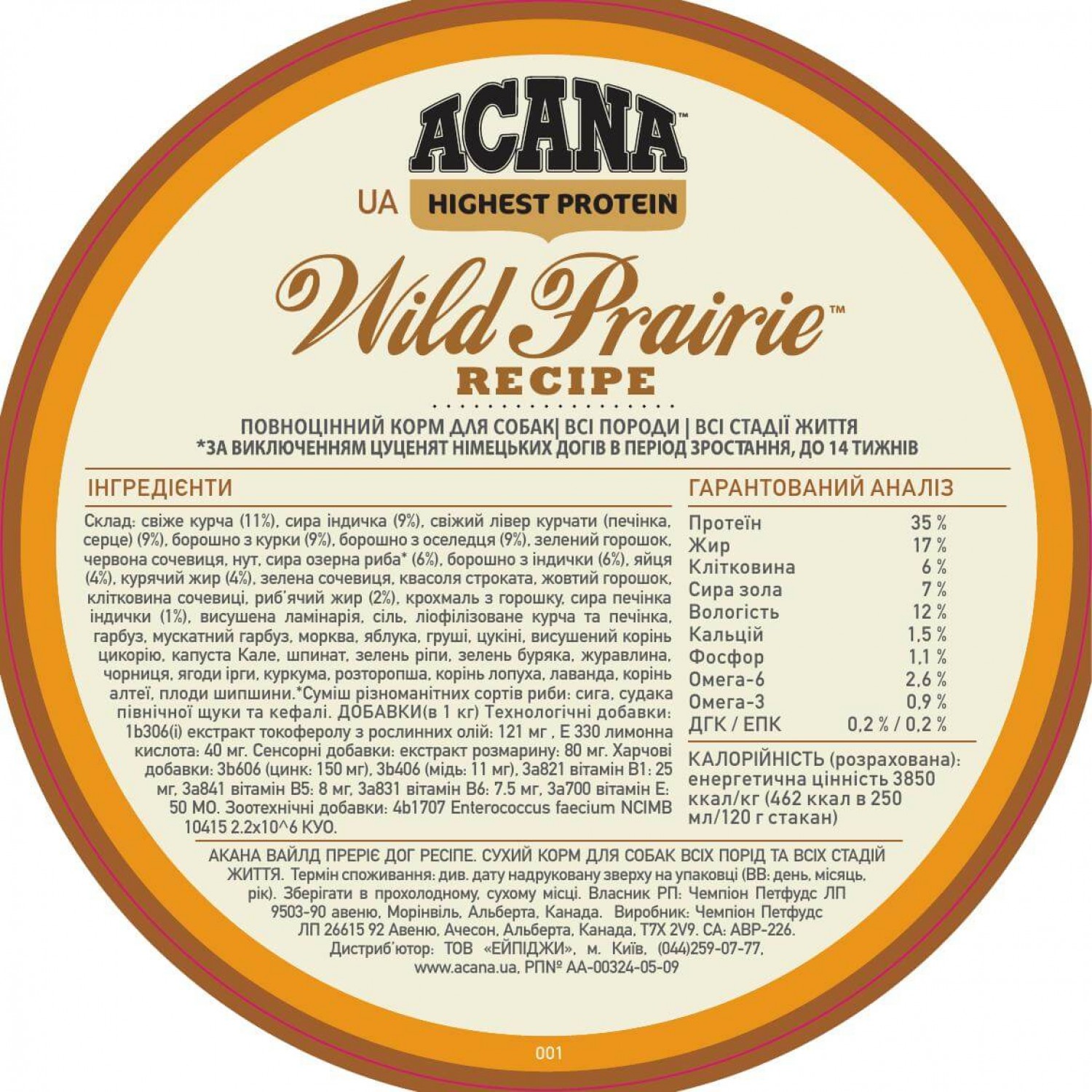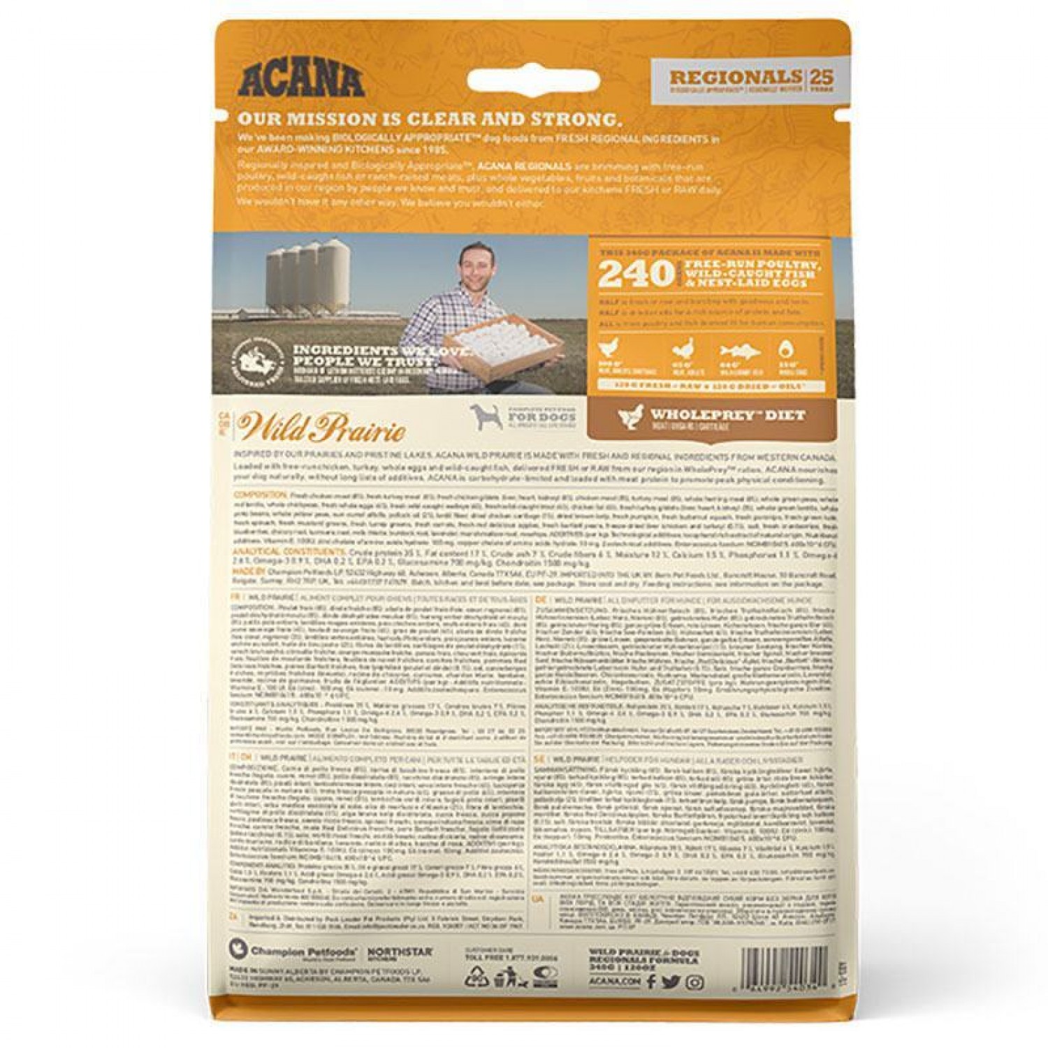 Рацион ACANA Wild Prairie Dog Recipe создан в соответствии с уровнями питательности установленных FEDIAF для собак всех стадий жизни, за исключением щенков немецких догов до 14 недель.