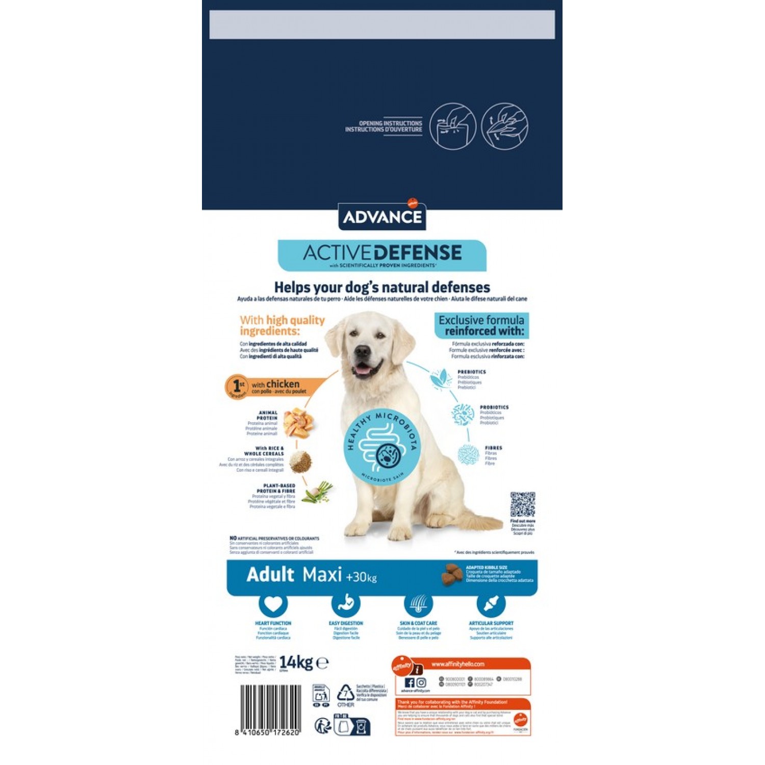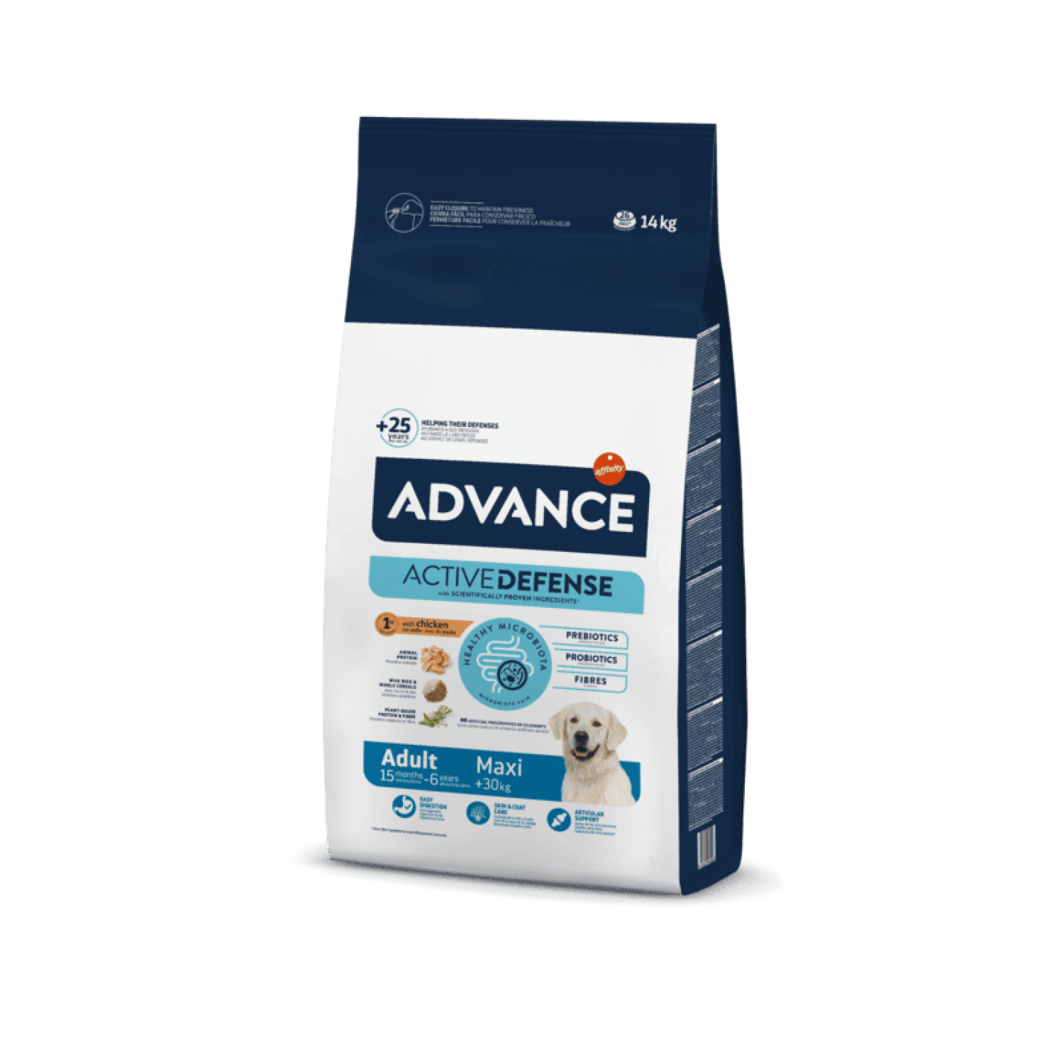 Advance Dog Maxi Adult - это высококачественный, сбалансированный, полнорационный корм для взрослых собак крупных пород с курицей и рисом (вес более 30 кг), предназначенный для возраста от 15 месяцев до 6 лет.