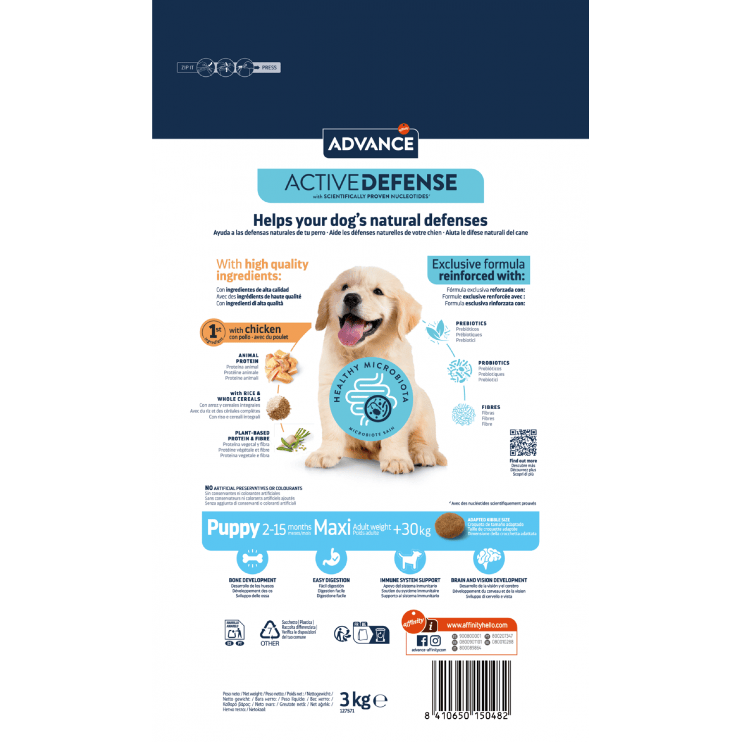 Advance Dog Maxi Puppy - это полноценный и сбалансированный корм с курицей и рисом, специально созданный для щенков крупных пород в возрасте от 2 до 15 месяцев, вес взрослых представителей которых составляет 30 кг и более. Рацион обеспечивает оптимальный рост, развитие и поддержание иммунной системы на ключевом этапе жизни щенка.