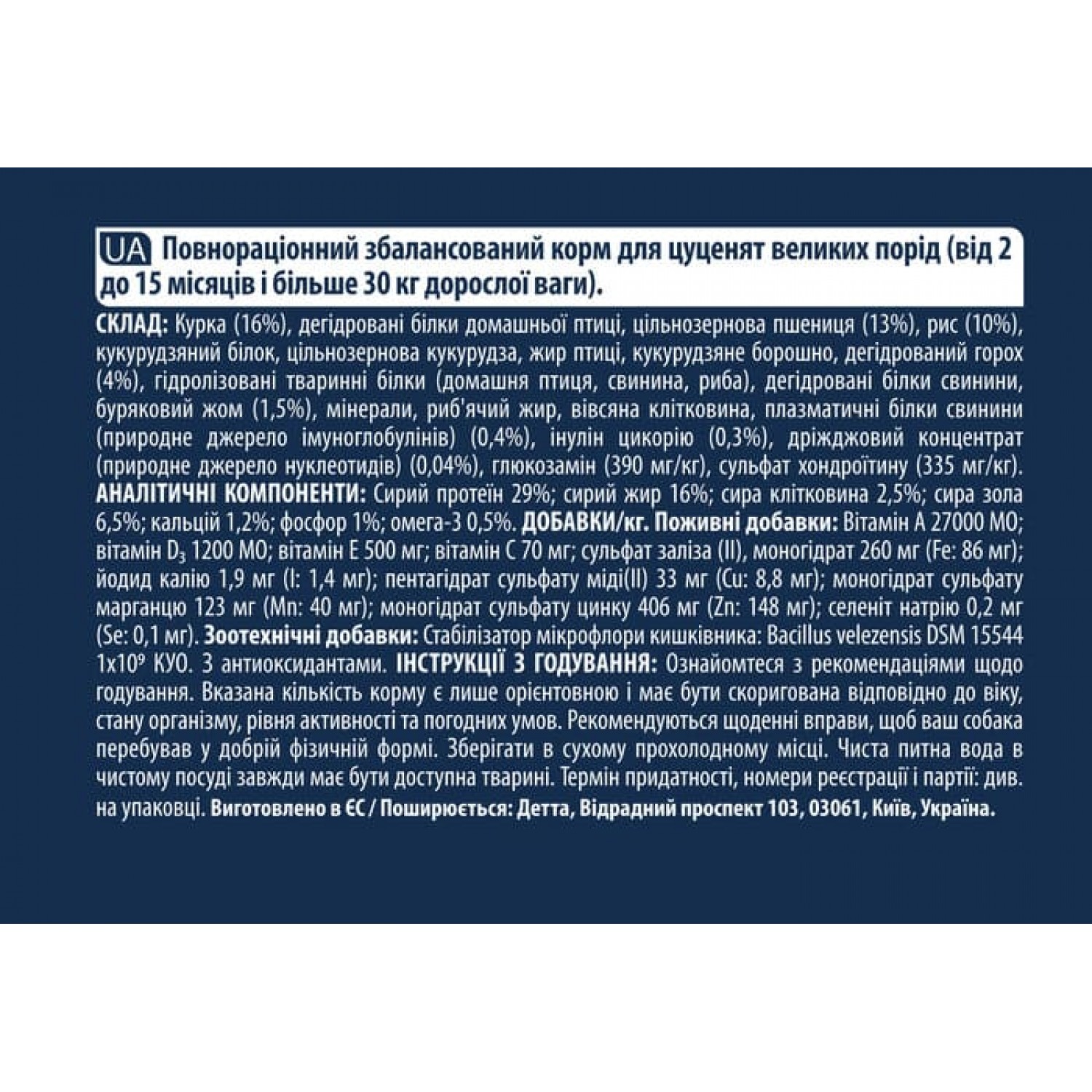 - Корм содержит оптимальное соотношение кальций-фосфор для безупречного развития костей растущего щенка.