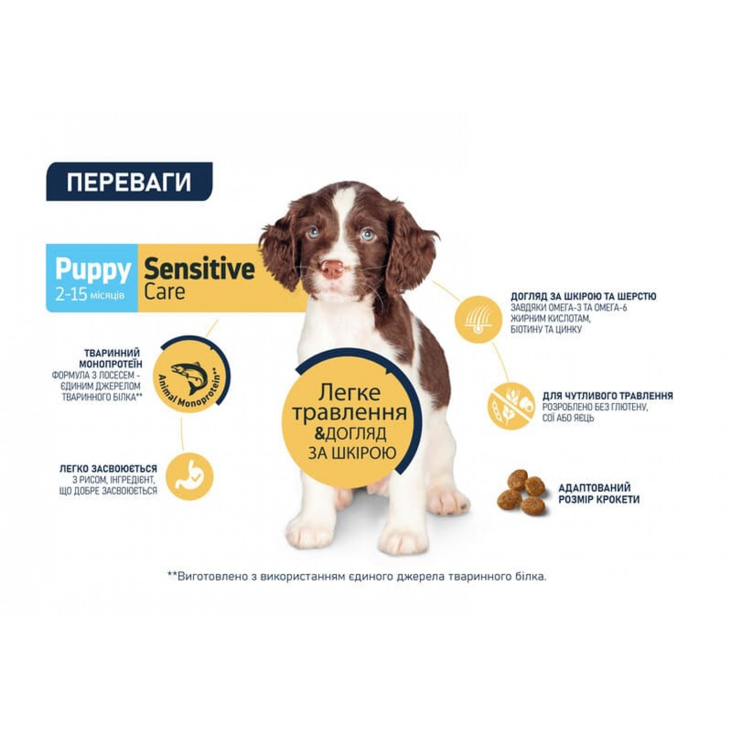 • Изготовлен исключительно на основе лосося, который является легкоусвояемым источником белка, идеальным для щенков и взрослых собак с непереносимостью других видов белка.