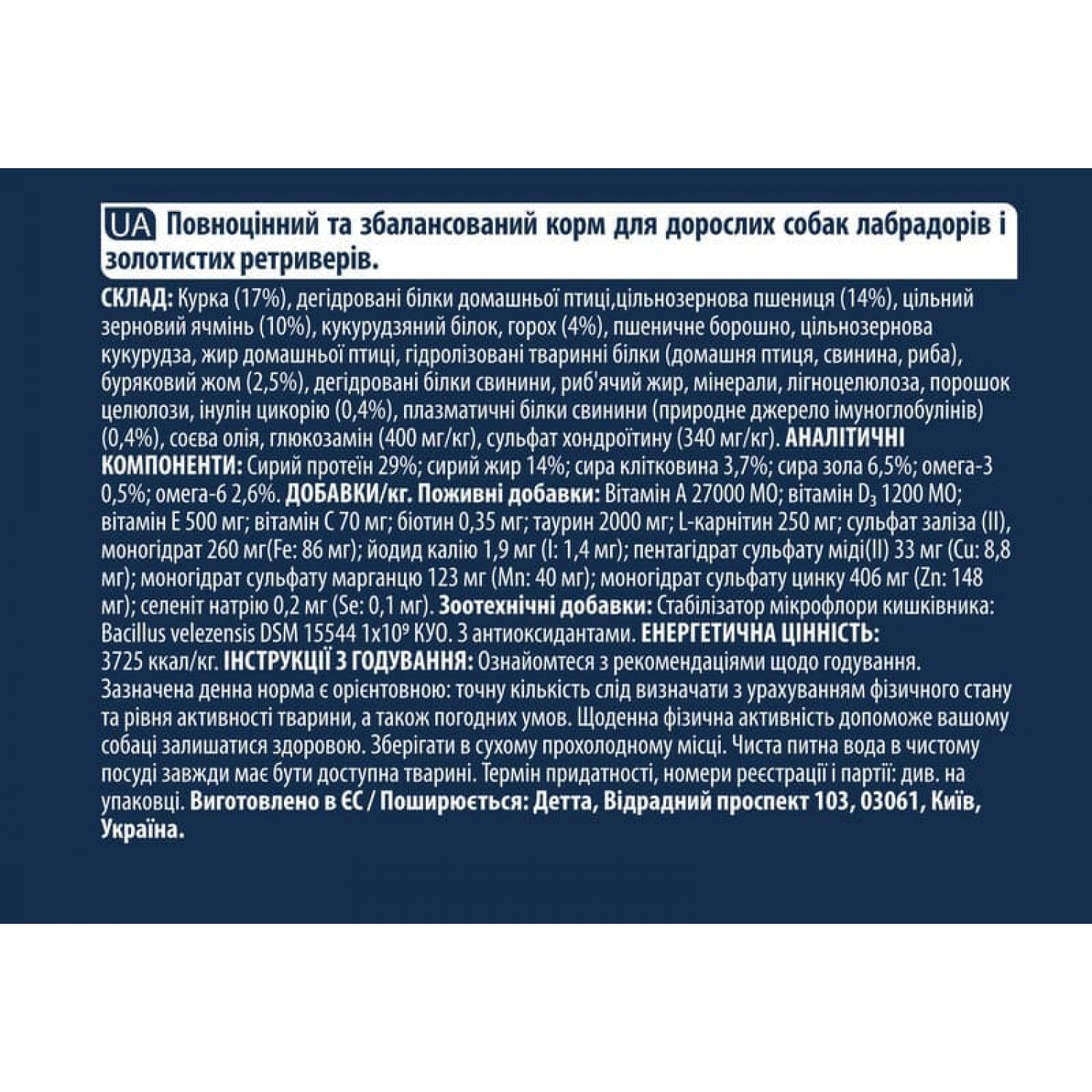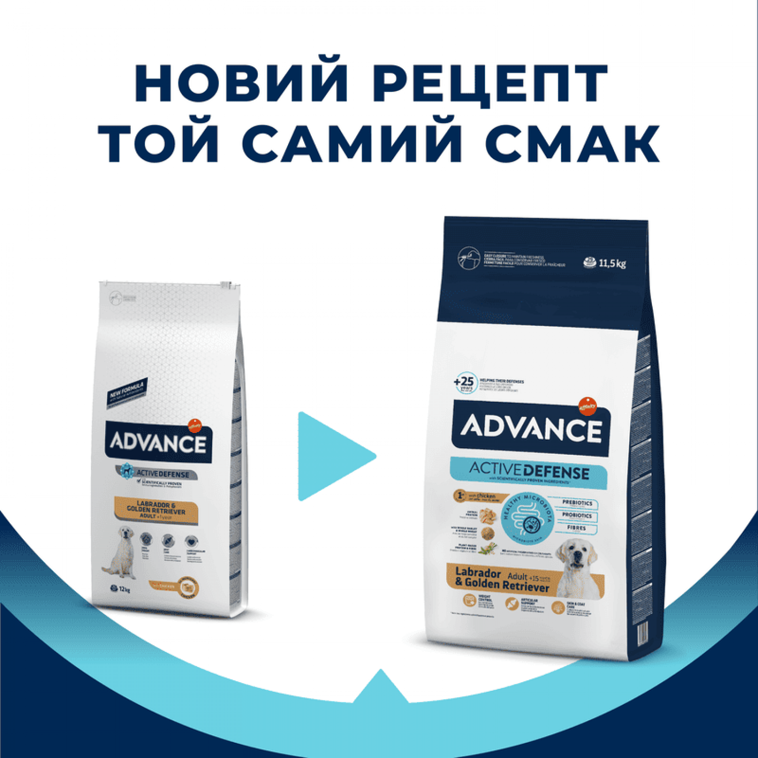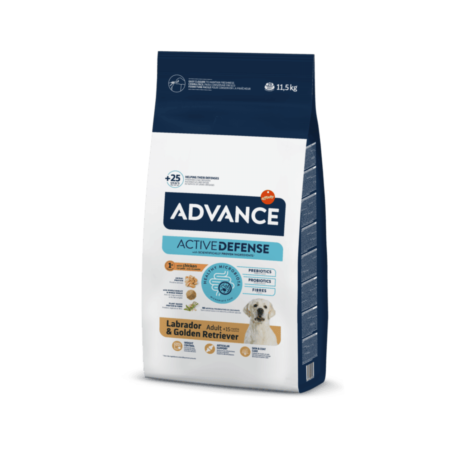 Advance Dog Labrador & Golden Retriever - это высококачественный, сбалансированный, полнорационный корм, который был специально разработан для удовлетворения пищевых нужд собак пород Лабрадор и Золотистый ретривер с 15 месяцев. Корм содержит специальные функциональные ингредиенты с оптимальным уровнем калорийности для поддержания идеального веса Лабрадора, а структура гранул адаптирована специально для этих пород.