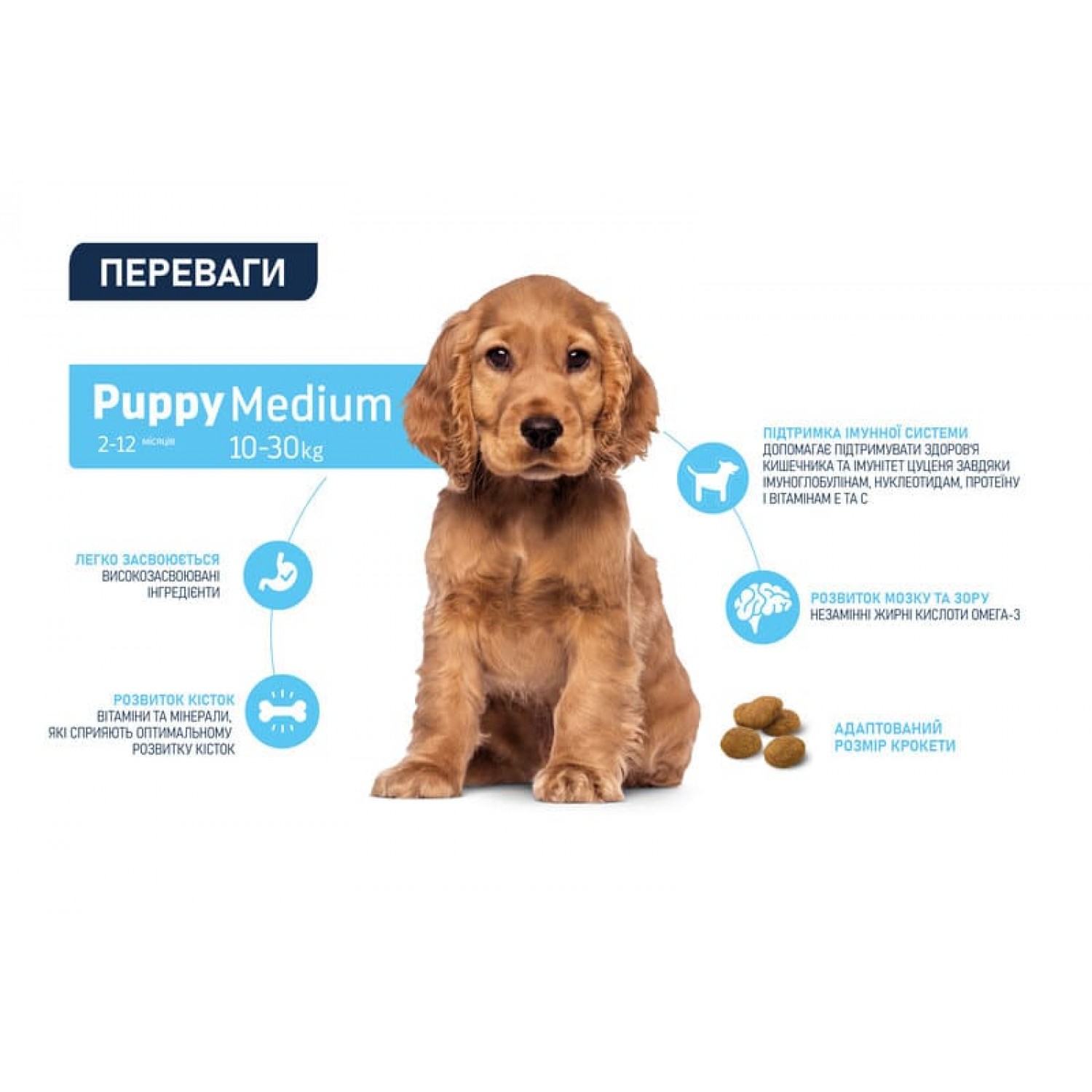 - Гранулы среднего размера оптимально подходят для собак средних пород.