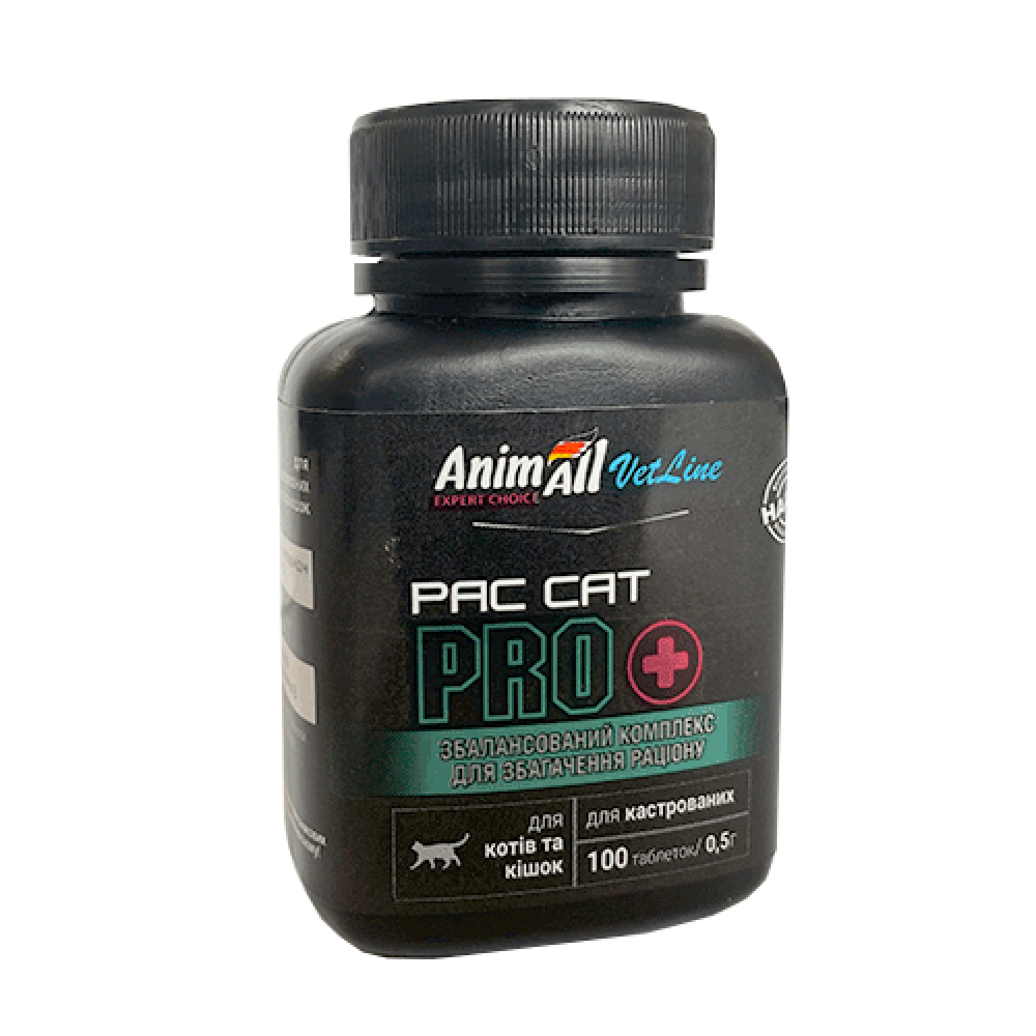 AnimAll VetLine Pac Cat PRO - сбалансированный комплекс для обогащения рациона кастрированных котов и кошек, предназначен для дополнения суточной потребности в витаминах и сбалансирования окислительно-восстановительных процессов в организме.