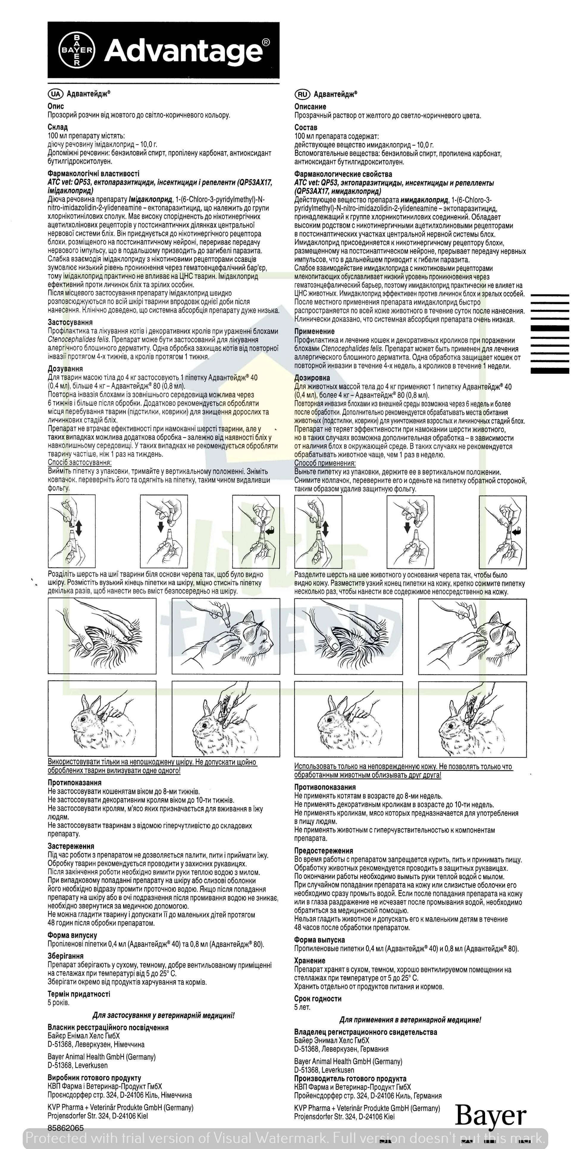 Bayer Advantage 80 Для предупреждения и лечения инвазии блохами у котов и декоративных кроликов .