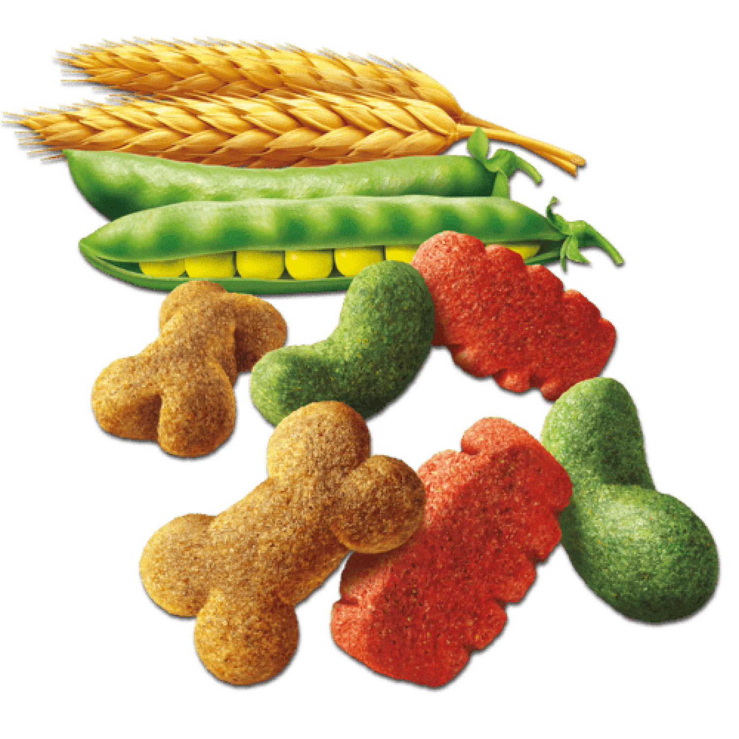 Изготовлен в виде хрустящих крокетов разных форм и цветов с говядиной и натуральным соком гороха и моркови.