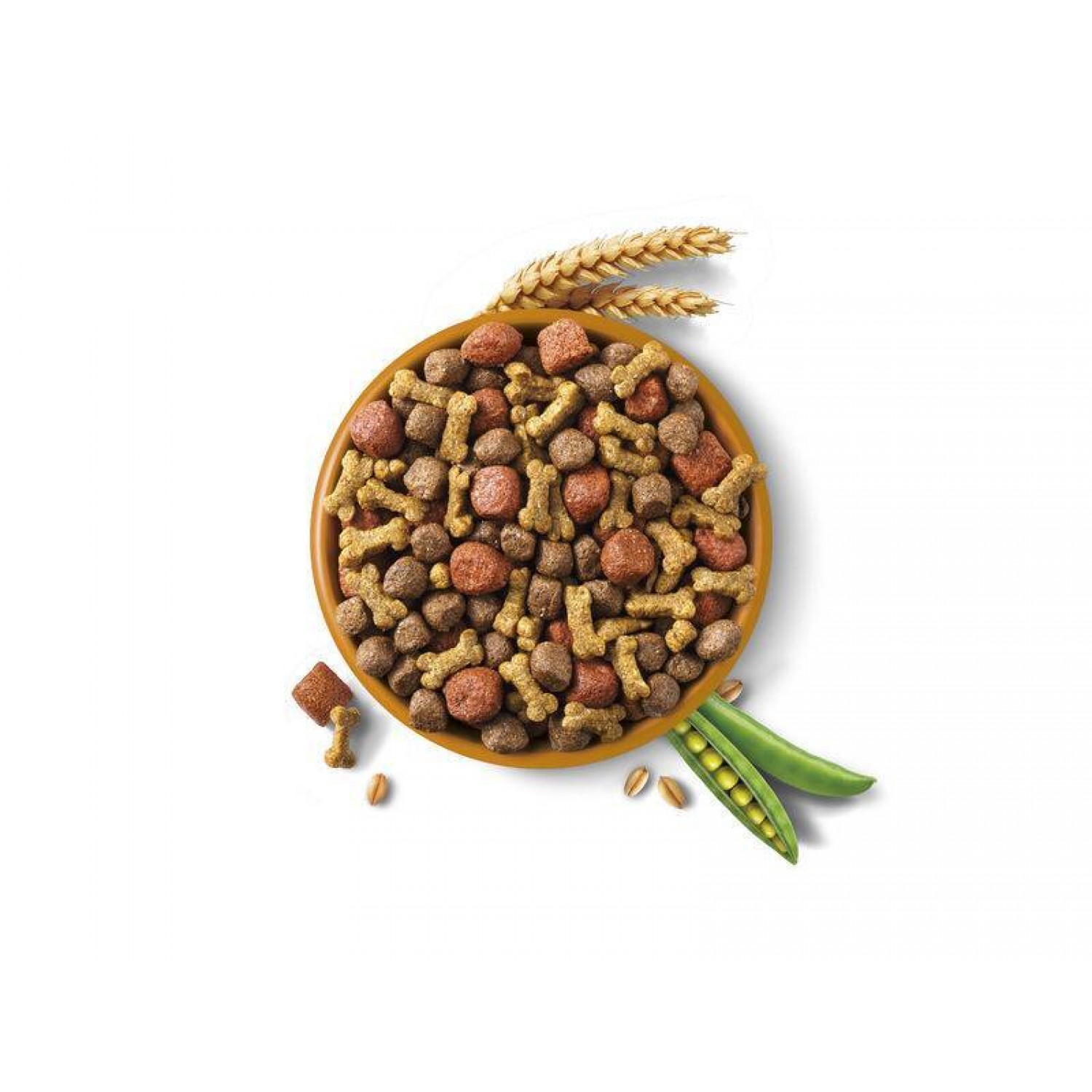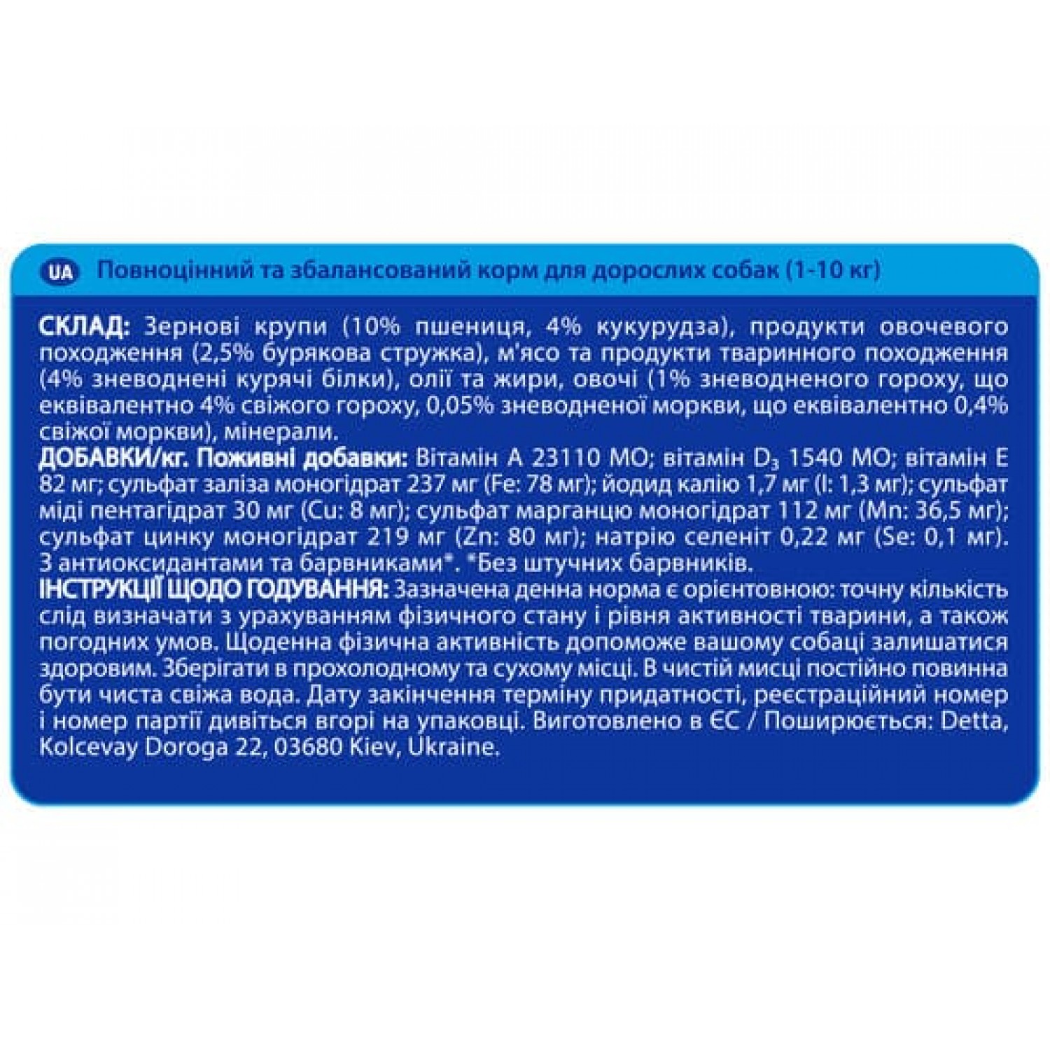 Состав: зерновая крупа (10% пшеница, 4% кукуруза), продукты овощного происхождения (2,5% свекольная стружка), мясо и продукты животного происхождения (4% обезвоженные куриные белки), масла и жиры, овощи (1% обезвоженного гороха, что эквивалентно 4% свежего гороха, 0,05% обезвоженной моркови, что эквивалентно 0,4% свежей моркови), минералы, антиоксиданты и натуральные красители.