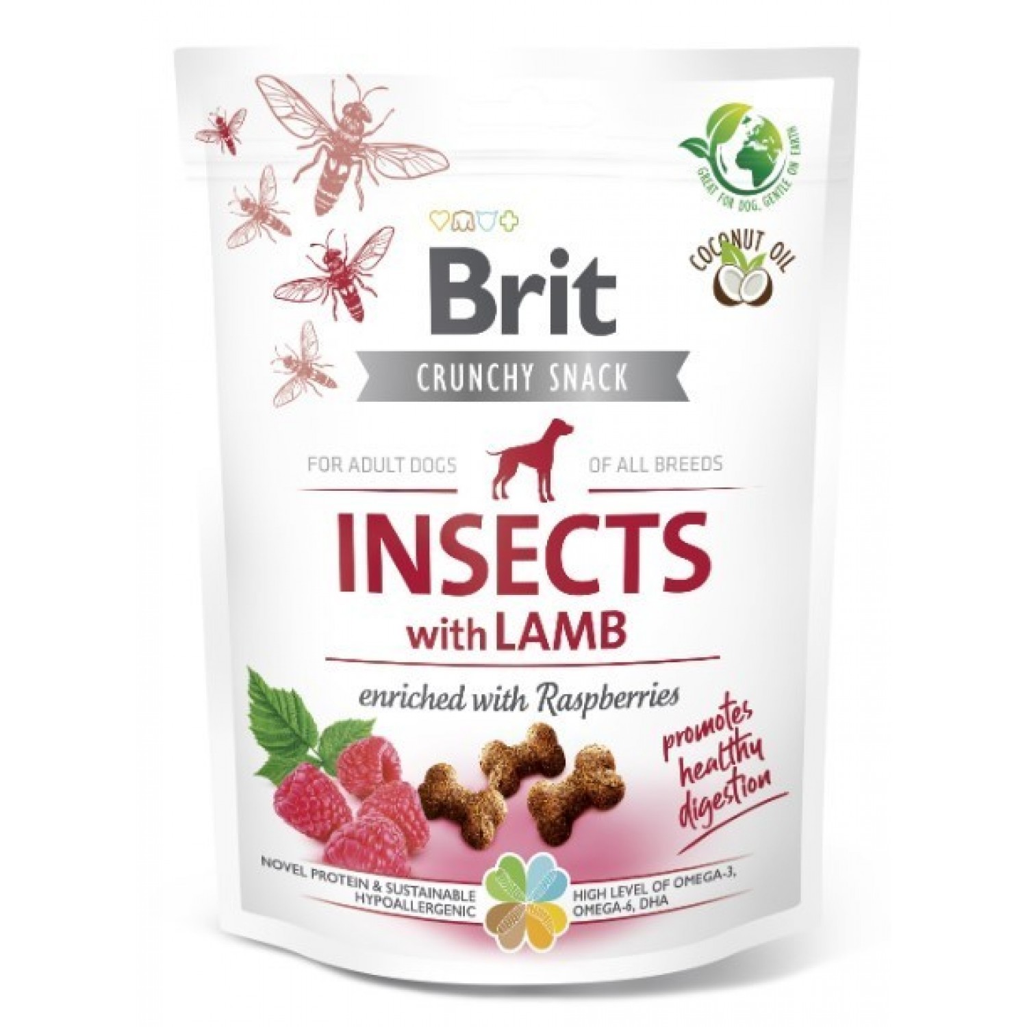 Brit Care Dog Crunchy Cracker Insects лакомства для пищеварения собак с насекомыми, ягненком и малиной.