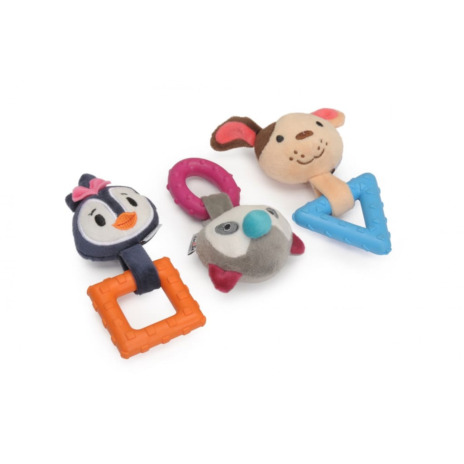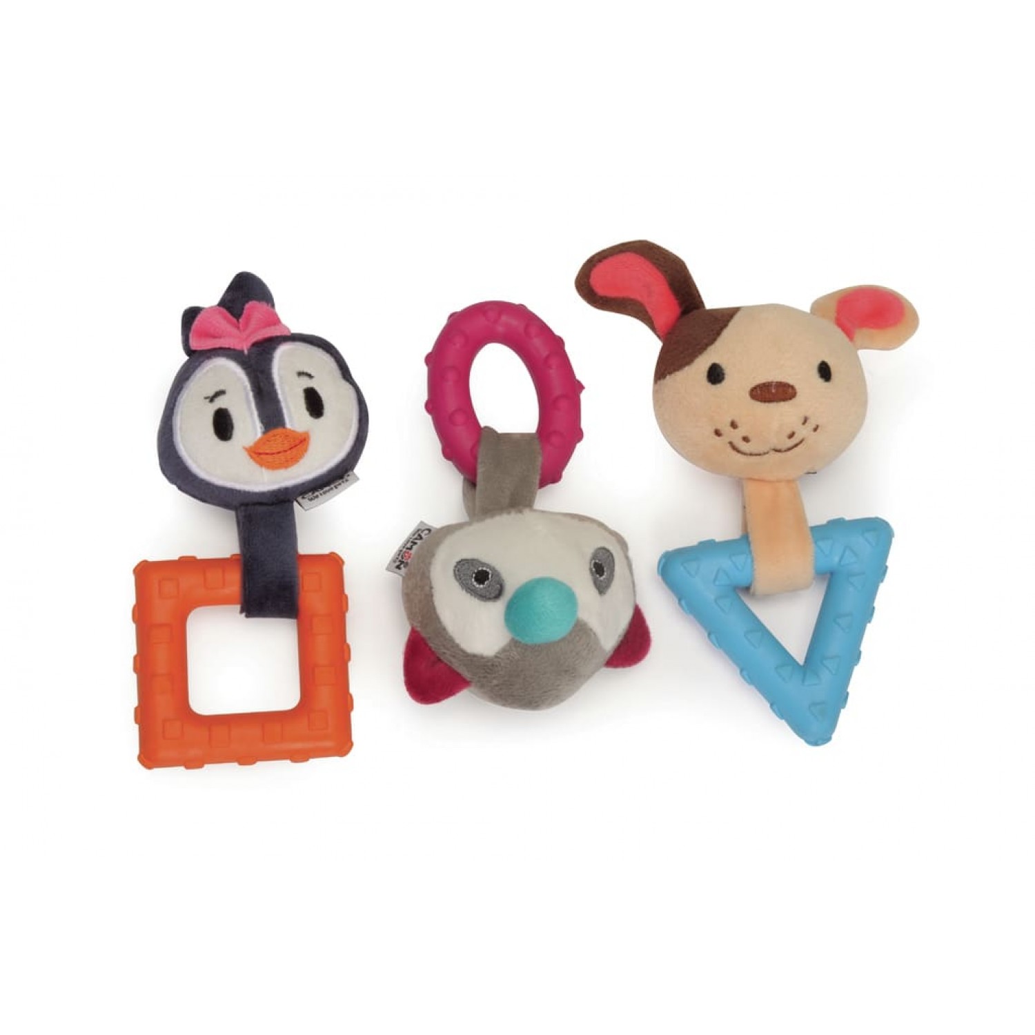 - Различные текстуры - рельефная поверхность TPR и мягкий текстиль удовлетворяют тактильные потребности и поощряют жевание.